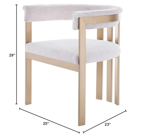 Take your modern kitchen or dining room design to a whole new level with the Beige Gold Dining Chair. These super stylish dining chairs are made with a sturdy steel base in a gold finish, a comfortable high back, and super soft upholstery with glamorous white fabric. The backrest features three vertical stainless steel tubes that support the backrest and go down as part of the frame. With their classic modern design and unprecedented functionality, they will instantly elevate the modern appeal of your home. Features. Modern Dining Chair for Fashionable Seating. Features a Gold Stainless Steel Legs. Slat Back StyleIncludes. Includes Plastic Guides on the Bottom to help protect floors.Specifications. Color Beige. Material Fabric, Stainless Steel. Back Style Slat back. Leg Material Solid Wood. Leg Color Gold. Room Dining Room. Dimension 25 W x 29 H x 23 D. Weight 30 lbs