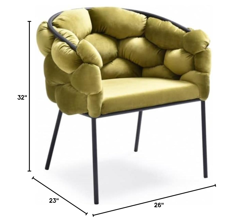 Add style and a striking visual touch with the Moss Green Velvet and Black Velvet Dining Chair. This uniquely designed dining chair features a tubular metal frame with a modern black finish that envelops you in comfort. The velvet back and arms are sewn into geometric hexagonal cushions for comfort and to create a super unique and interesting look. The cushion seat itself is padded with a thick foam, which adds to the excellent comfort and support that this chair brings. This chair is more than a dining chair and will also be a striking accent chair in the living room, office or bedroom. 32'H x 26'W x 23'D