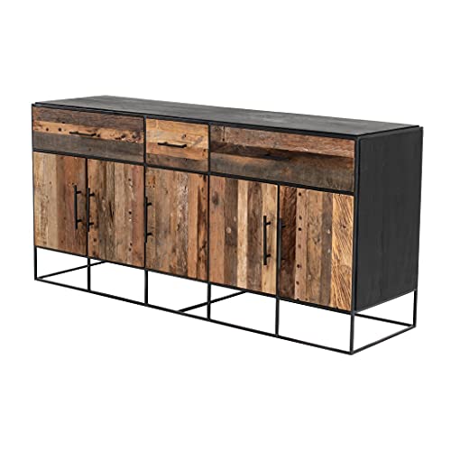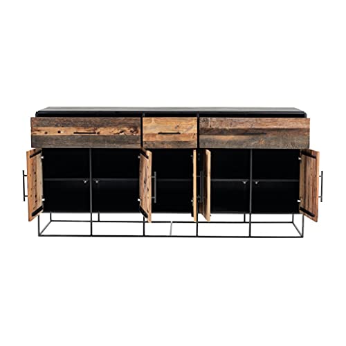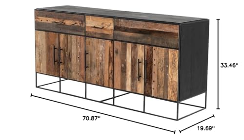 Update your space with this Modern Rustic Black Buffet Server. Handcrafted by skilled artisans to give off a unique and updated industrial modern vibe, this cabinet can be used as a buffet server, TV Stand, or even a low dresser. The slim black iron frame encases the cabinet while the natural distressed woods, plywoods, and re-claimed wood pieces are curated special for each piece and stained in a dark black for the case and left in their natural unique form for the drawers and cabinets. The cabinet has three drawers, two large and one smaller, with two sets of double door cabinets and a single door cabinet below. The combination of the warm color wooden panels, the stained black inside and the black retro iron frame will make the cabinet stand out. The measurements are 33.46' x 70.87' x 19.69'.