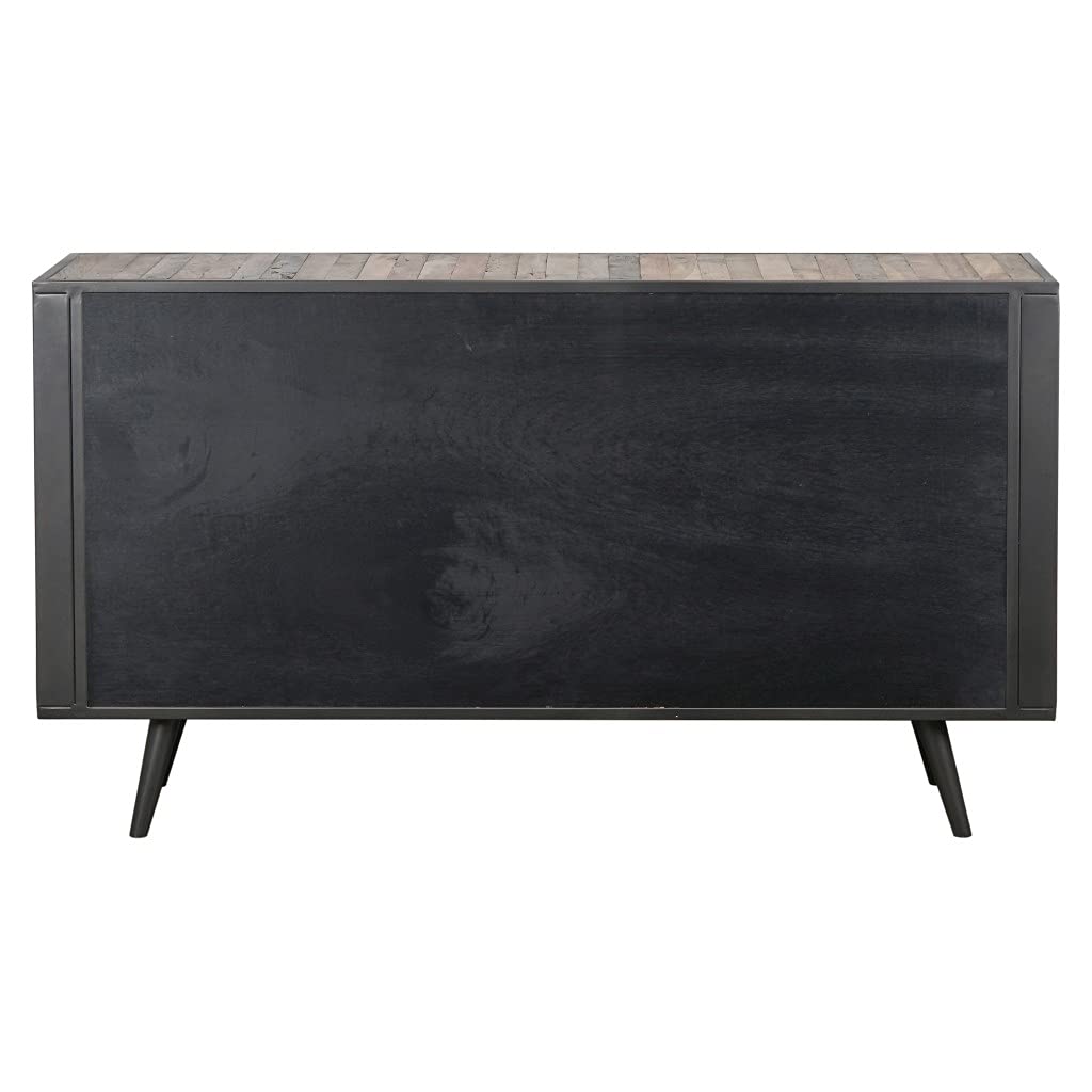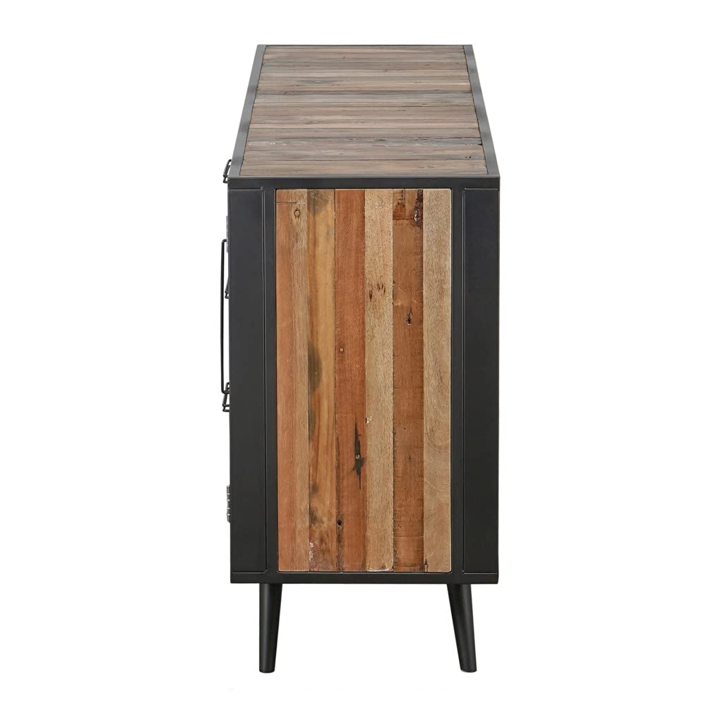 Update your space with this Modern Rustic Black Natural and Rattan Buffet Server. Handcrafted by skilled artisans to give off a unique and updated industrial modern vibe, this cabinet can be used as a buffet server, TV Stand, or even dresser. The slim black iron frame encases the cabinet while natural wood grain panels stripe the unit giving it delightfully special and eye catching effect. The natural distressed woods, plywoods, and re-claimed wood pieces are curated special for each piece giving this cabinet true uniqueness, in that no two are exactly alike.The cabinet has three drawers from top to bottom and two doors with fixed internal shelving on either side. The combination of the warm color wooden panels, the stained black inside and the black retro iron frame will make the cabinet stand out. The mesh door design that includes hand woven split rattan covering the storage compartments also gives a unique twist to the whole style. The measurements are 35.43' x 62.99' x 17.72'.