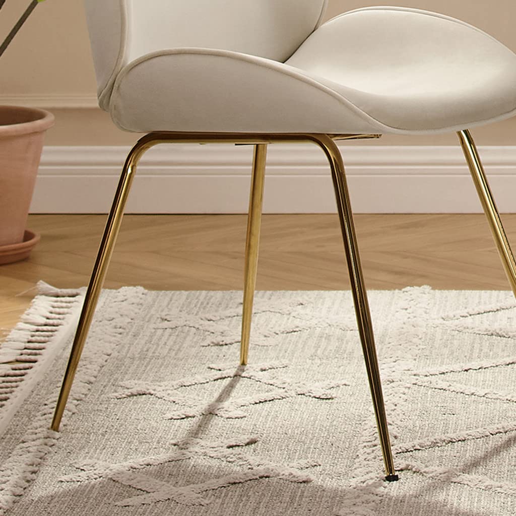Enhance your dining experience and add a contemporary style to your space with this Set of Two Gold and Beige Velvet Shell Shape Dining Chairss. The pleasing visual color combines the beige velvet shell shape cushions and the golden metal legs, making it attractively inviting you to take a relaxing sit. The superb comfortable velvet cushions and armless shell shape were designed to make it perfect for any dining or other empty places in your home or office. It features soft foam padded cushions that are made to stay in shape to give you a comfortable seat that last-long. The golden metal legs are perfectly made to make the Chairs sturdy and durable. Set the touch of elegance and little glamour on your dining area or in any contemporary setting with this shell shape dining Chairs.