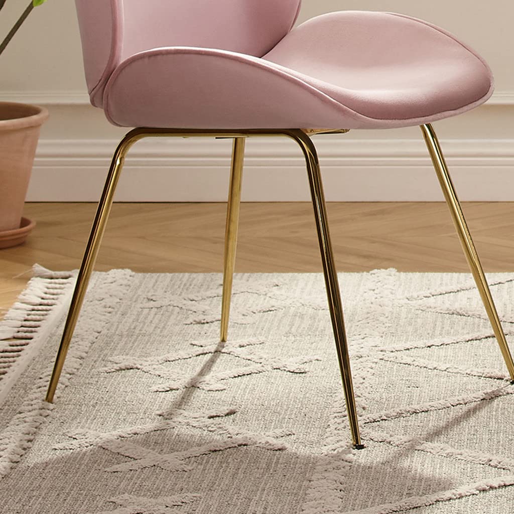 Enhance your dining experience and add a contemporary style to your space with this Set of Two Gold and Pink Velvet Shell Shape Dining Chairss. The pleasing visual color combines the pink velvet shell shape cushions and the golden metal legs, making it attractively inviting you to take a relaxing sit. The superb comfortable velvet cushions and armless shell shape were designed to make it perfect for any dining or other empty places in your home or office. It features soft foam padded cushions that are made to stay in shape to give you a comfortable seat that last-long. The golden metal legs are perfectly made to make the Chairs sturdy and durable. Set the touch of elegance and little glamour on your dining area or in any contemporary setting with this shell shape dining Chairs.
