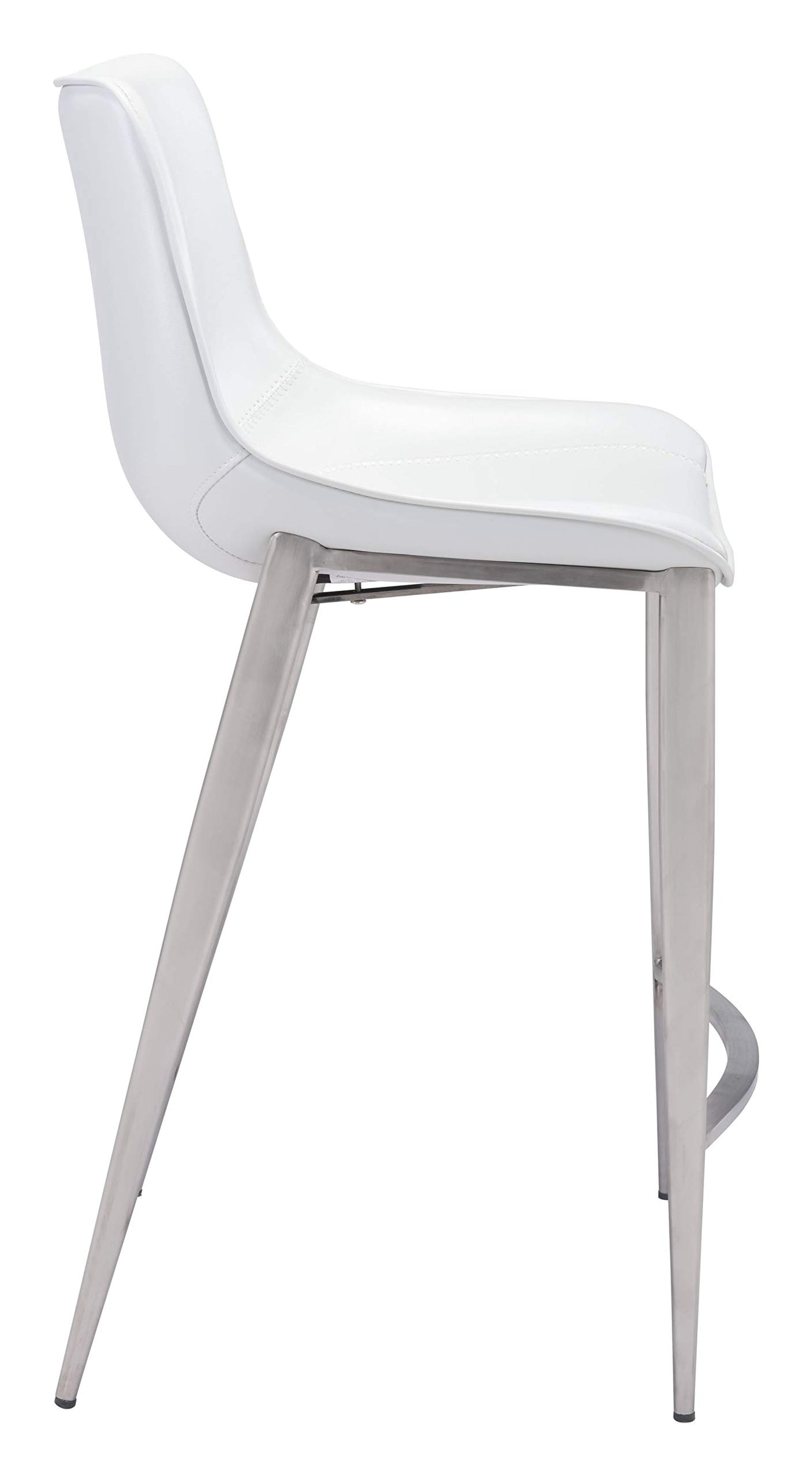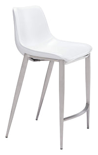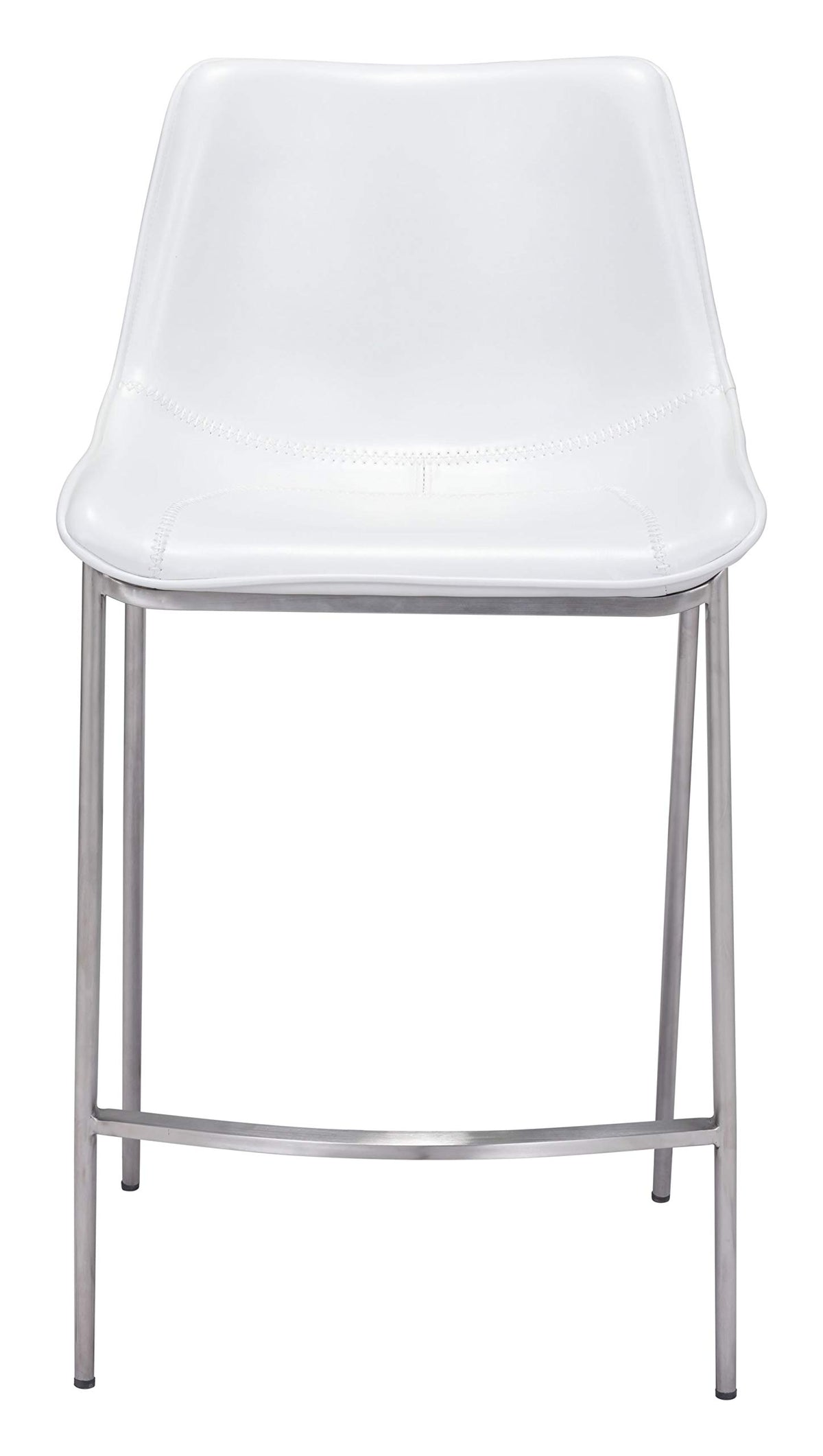 High design meets everyday casual. This handsome counter chair with its slim profile pulls up perfectly to the bar. Its super comfortable curved seat is covered in white faux leather with dramatic stitching. Brushed stainless steel legs are complete with protective plastic feet to keep your floors scratch-free.