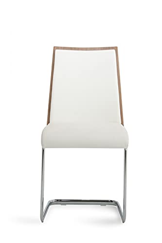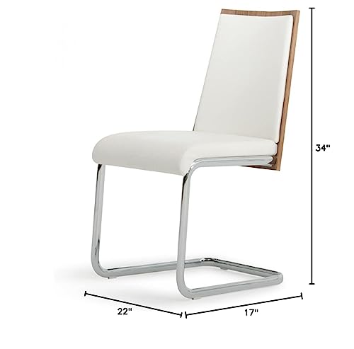 Modern White Faux Leather Walnut Finish Dining Chairs HomeRoots offers a wide variety of choices, in the tensofthousands and growing, in furniture, lighting and home decor products at extremely competitive pricing. This updated and fresh dining chair mixes flair and toughness featuring white leatherette upholstery against a light walnut veneer back. A polished chrome frame keeps this dining chair together and combines with the other mediums to it a special look. This contemporary styled dining chair is hard wearing, comfortable, and ideal for around the table or extra seating as an accent in the living room or bedroom. H34X W22 x D17 x each. Set of 2. Specifications. Color White, Walnut. Style Modern. Material Faux Leather. Dimension 34 H x 22 W x 17 D. Weight 39 lbs
