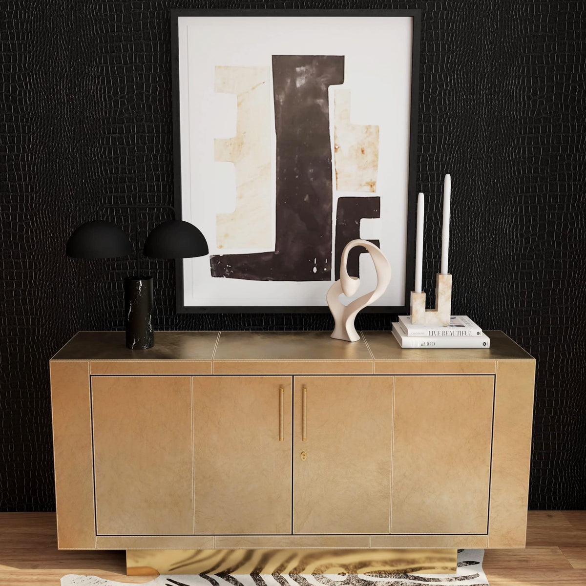 This modern buffet is gorgeous in every way imaginable. Its elegant lines are adorned with finely tailored leather on a brass platform base. Proving that all that glitters is not gold, its two brass-finished handlebar doors open to reveal a luxurious interior fully lined in polysuede with meranti wood trim with two adjustable shelves in each of the two side storage compartments, An adjustable shelf in the center storage compartment and a tray drawer with a gold leather front and ball bearing glides for smooth operation. Masterfully crafted from meranti wood solids and wood products, it has a brass door lock that operates with a brass key with a matching gold leather tassel.