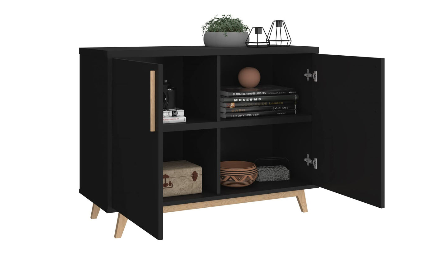 There are so many uses for this versatile piece of furniture Buffet Server, TV Stand, Accent Cabinet, Console Table, Sofa Table and more. The Modern Black and Natural Two Door Buffet Table can easily be used in dining room, office, home office, living room, bedroom, hallway, bathroom, and more. The clean simple design features two doors with an internal shelving that offers four spacious cubby areas to help keep everything fashionably in order. The angled flaired natural wood feet and door pulls give it a modern flair and add to the design appeal of this super practical and versatile item cabinet. 27x35x14 Features. Simple Clean Line Modern Accent Furniture. Expertly designed to accommodate most flat screen tvs up to 60 wide and 75 lbs. Easy to assemble with owners manual and easytofollow instructions. Multifunctional furniture can be used in many rooms/many ways. Fashionable Storage and OrganizationSpecifications. Color Black Natural. Material Wood. Style Modern. Country of Origin Brazil. Size 26.57 in.. Weight 60.63 lbs