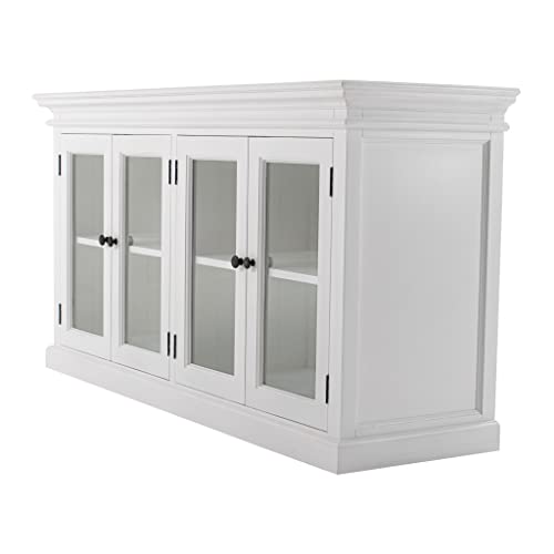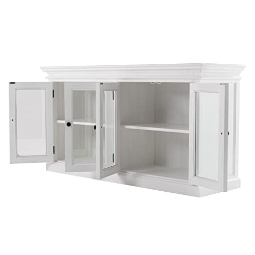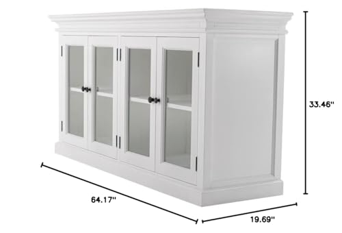 The modern farmhouse white glass door buffet server is the perfect embodiment of a storage compartment that is versatile enough to be used anywhere and everywhere. The buffet server has four glass doors with internal shelving that leads to four storage compartments. It will be perfect for storing your dishes and glasses, books, linens or any other item you want to store. Featuring crown molding and beveled details, the crisp white contrasts the black hardware giving this piece an ideal look for your living room, hallway, home office, kitchen, or just about anywhere in the home. Measurements are 33.46 x 64.17 x 19.69 inches.