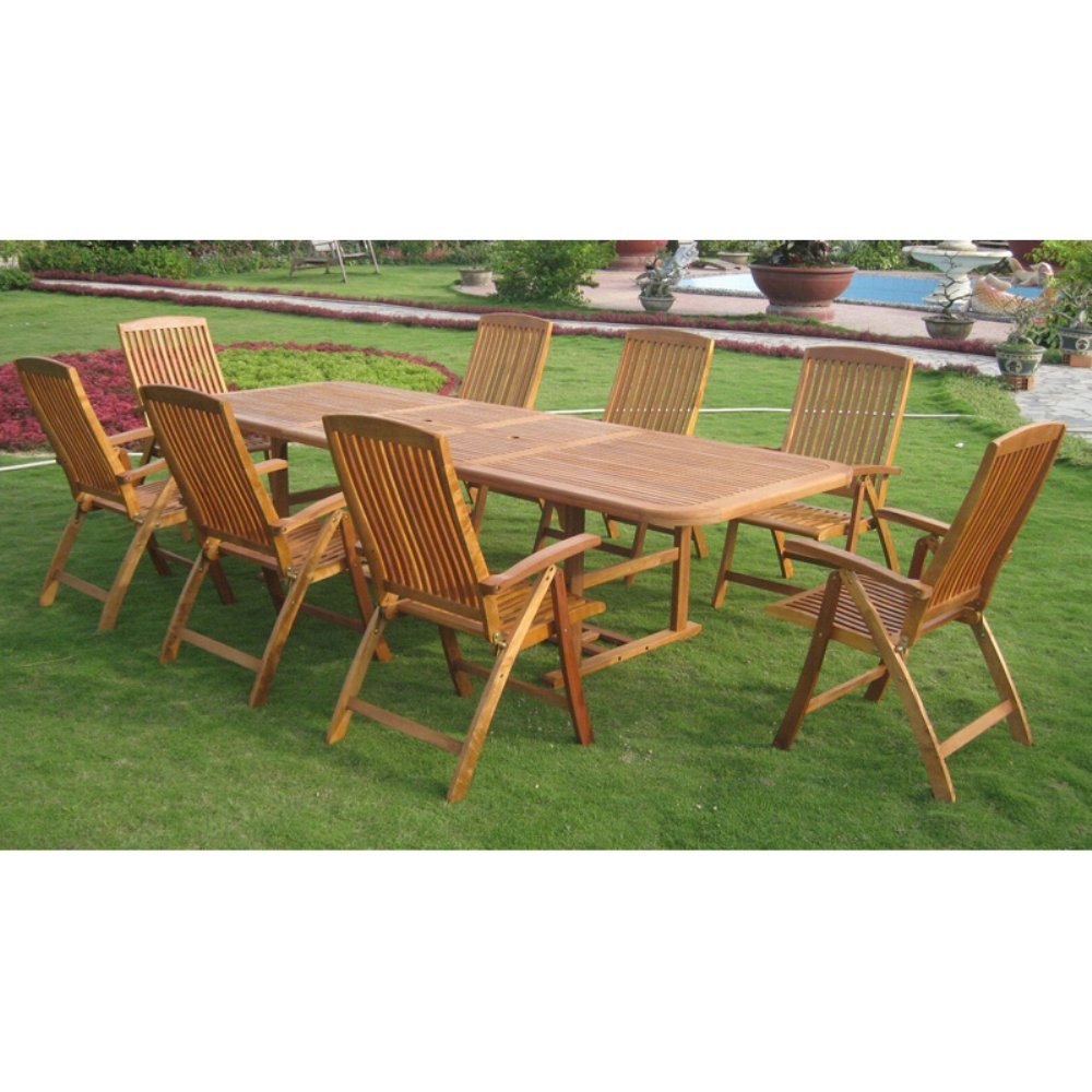 Add A Touch Of Comfort And Style To Your Outdoor Furnishings With This 9-Piece Dining Set, Featuring Butterfly Extendibility For Increased Versatility. Made From Belau Hardwood That Is Comparable To Teak Wood In Strength And Durability. Has A Natural Wood Finish. Set Comes With 8 Chairs (24W X 28D X 42H) That Are Five-Position That Allows For Versatility And Comfort. Chairs Will Also Fold For Easy Storage. The Table Will Extend To 3 Different Lengths 78/98/118 Long By 43 Inches Wide By 30 Inches High. Umbrella Hole Included In Table.