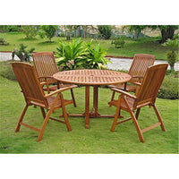 Have a pleasurable experience in the outdoors with this durable dining set. Its made from Belau wood for strength and durability with a natural wood finish. The five piece set features one round table ( 51 inches round by 29 inches high) and four folding chairs (24W x 28D x 42H) that are five-position that allows for versatility and comfort. Umbrella hole included in table.