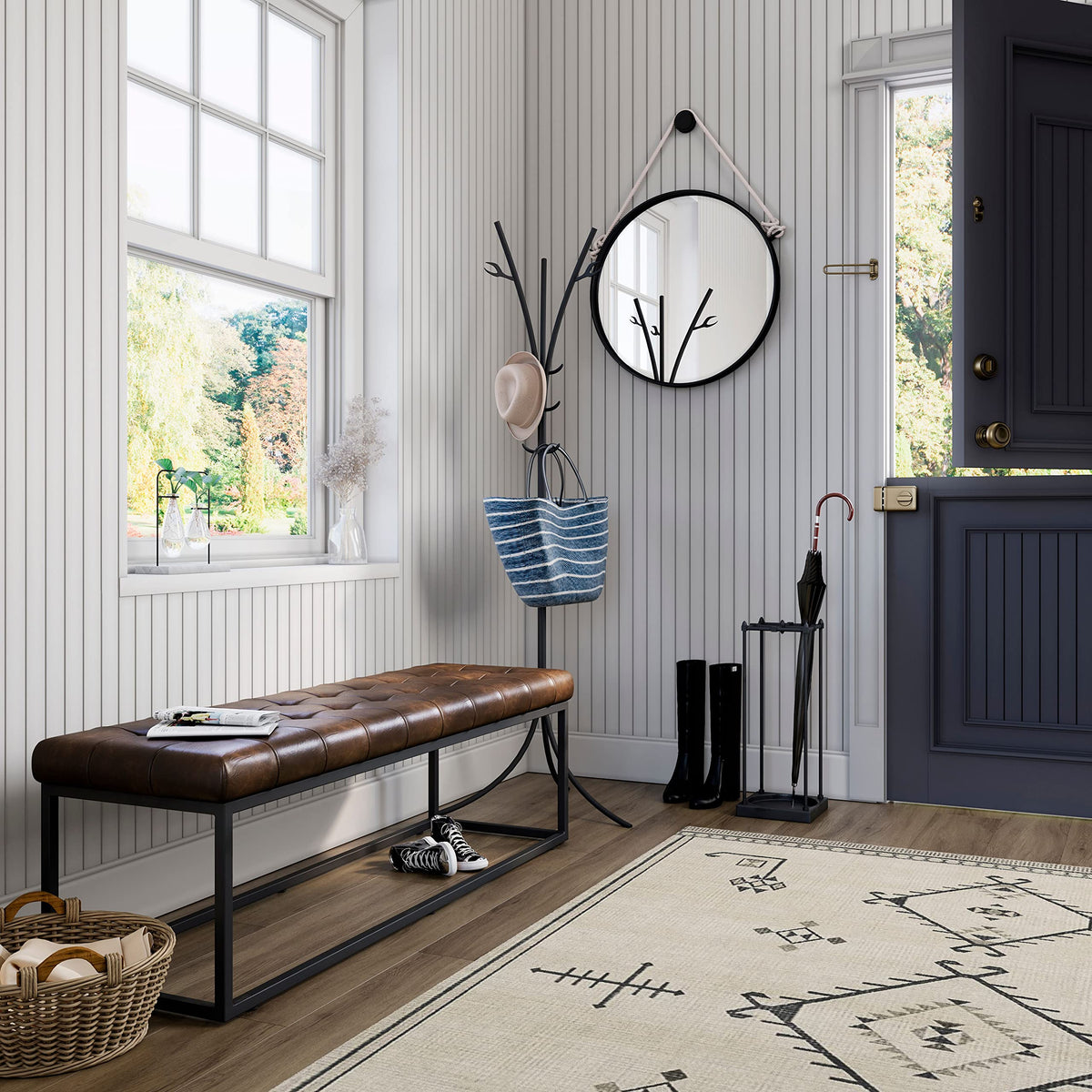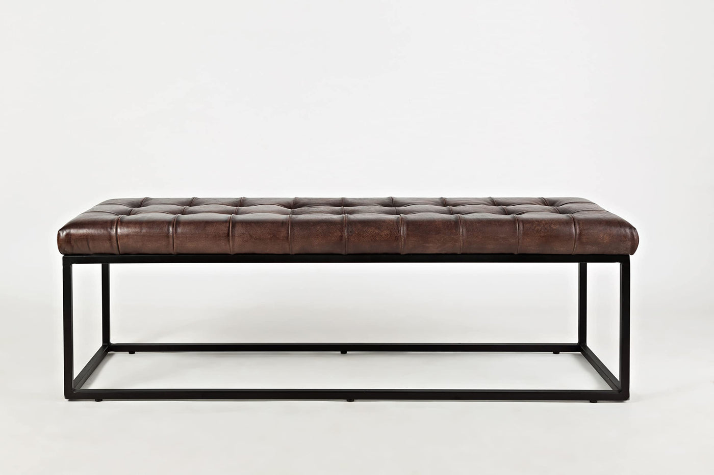 The incredible feel of genuine leather makes this fully assembled industrial style ottoman the perfect addition to your décor. Taking influence from luxury resorts around the world, the deep richness of the leather combined with the strength of iron creates an unforgettable combination that is sure to make a lasting impression in your home. Measuring 55’’ wide, this beautiful handcrafted bench looks great at the foot of your bed, in a hallway or can be used for additional seating in the living room. The space below the bench is ideal for storing shoes underneath, and the distressed natural leather brings rugged sophistication and industrial style to any room. Available in both Dark Sienna and Saddle finishes