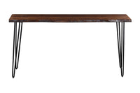 Breathtaking solid wood perfectly preserved in its most natural state makes this Live Edge counter Height Sofa Table not only beautiful but completely one-of-a-kind Our artisans select pieces of Acacia hardwood and then leave the natural edge of the tree whole to create a truly stunning visual effect This unique rectangular sofa table measures approximately 72 long by 18 wide as the dimensions of each piece will be slightly unique due to the live edge Sleek hairpin legs bring attention to the rich finish that makes every single inch of the hardwood grain stand out and look amazing This sofa table will make a stunning addition to any home decor with a combination of modern design and natural beauty Available in Natural, chestnut and Slate finishes