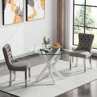 ?Dining Table Featrues? Materials: Glass Top, Metal Legs,Which Is Stable And Won'T Shake.More Natural And Authentic, Unconstrained. Breaking The Limitations Of A Single Material To Achieve Material Freedom The Smooth Surface Is Easy To Clean And Can Help You Save A Lot Of Time And Effort.The Product'S Attention To Detail Is Exquisitely Crafted, With Every Detail Carefully Designed Our High-Quality Products Are Achieved Through Innovative Design, Exquisite Craftsmanship, And Unique Details Due To Lighting Or Display, The Actual Product Color May Differ Slightly From The Image.Our High-Quality Products Are Achieved Through Innovative Design, Exquisite Craftsmanship, And Unique Details ?Dining Chairs Featrues? Handcrafted Decorative Nailhead Trim Completes The Design With A Dash Of Distinction; Stainless Steel Plated Gold/Silver Chair Legs; Easy To Assemble With A Brief Manual Provided. The Cushion Uses A High Rebound Sponge,Rubber Bands And Steel Springs, Triple Elastic Structure Providing You With A Long-Term Comfortable Seating Experience.