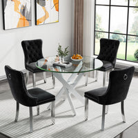 ?Dining Table Featrues? Materials: Glass Top, Metal Legs,Which Is Stable And Won'T Shake.More Natural And Authentic, Unconstrained. Breaking The Limitations Of A Single Material To Achieve Material Freedom The Smooth Surface Is Easy To Clean And Can Help You Save A Lot Of Time And Effort.The Product'S Attention To Detail Is Exquisitely Crafted, With Every Detail Carefully Designed Our High-Quality Products Are Achieved Through Innovative Design, Exquisite Craftsmanship, And Unique Details Due To Lighting Or Display, The Actual Product Color May Differ Slightly From The Image.Our High-Quality Products Are Achieved Through Innovative Design, Exquisite Craftsmanship, And Unique Details ?Dining Chairs Featrues? Handcrafted Decorative Nailhead Trim Completes The Design With A Dash Of Distinction; Stainless Steel Plated Gold/Silver Chair Legs; Easy To Assemble With A Brief Manual Provided. The Cushion Uses A High Rebound Sponge,Rubber Bands And Steel Springs, Triple Elastic Structure Providing You With A Long-Term Comfortable Seating Experience.