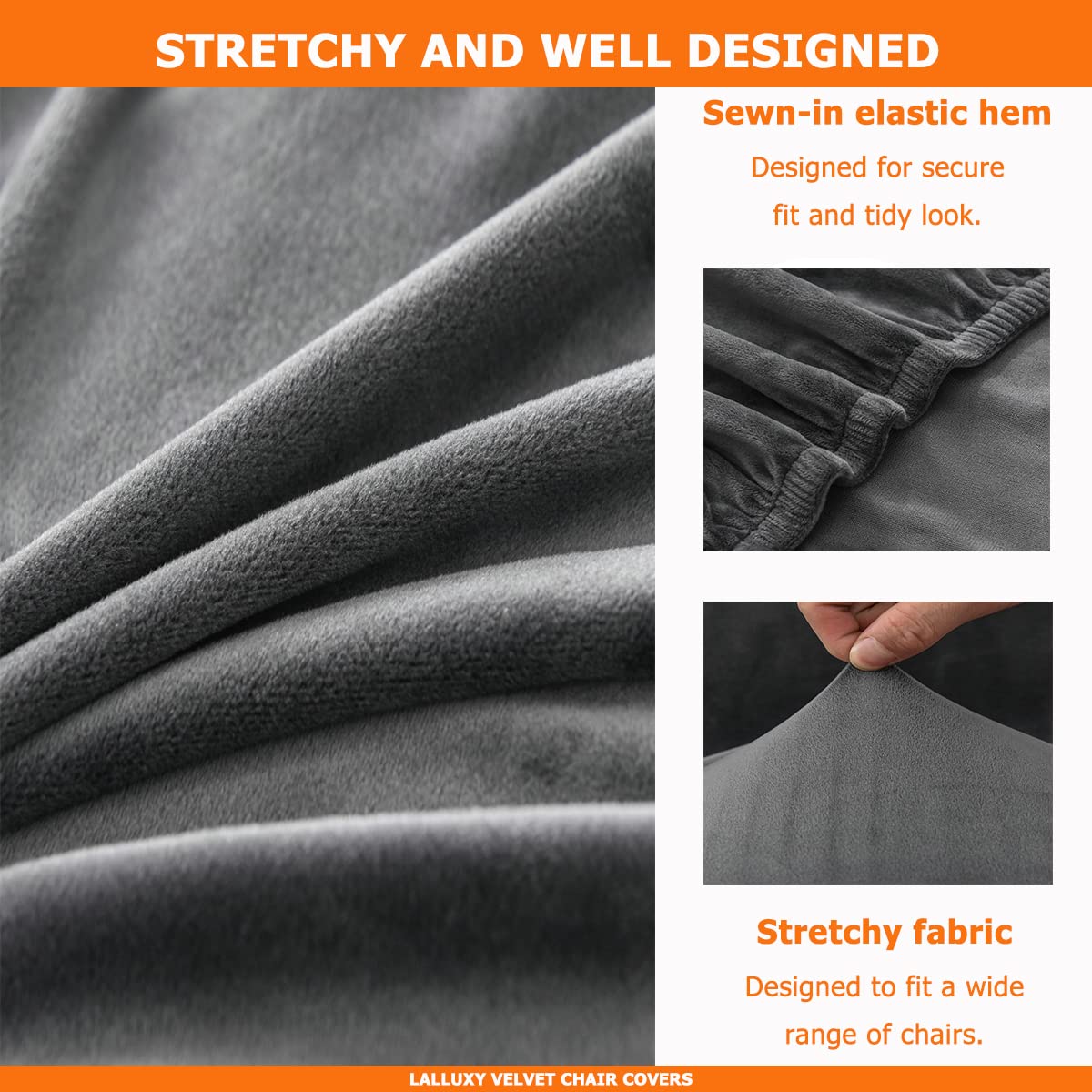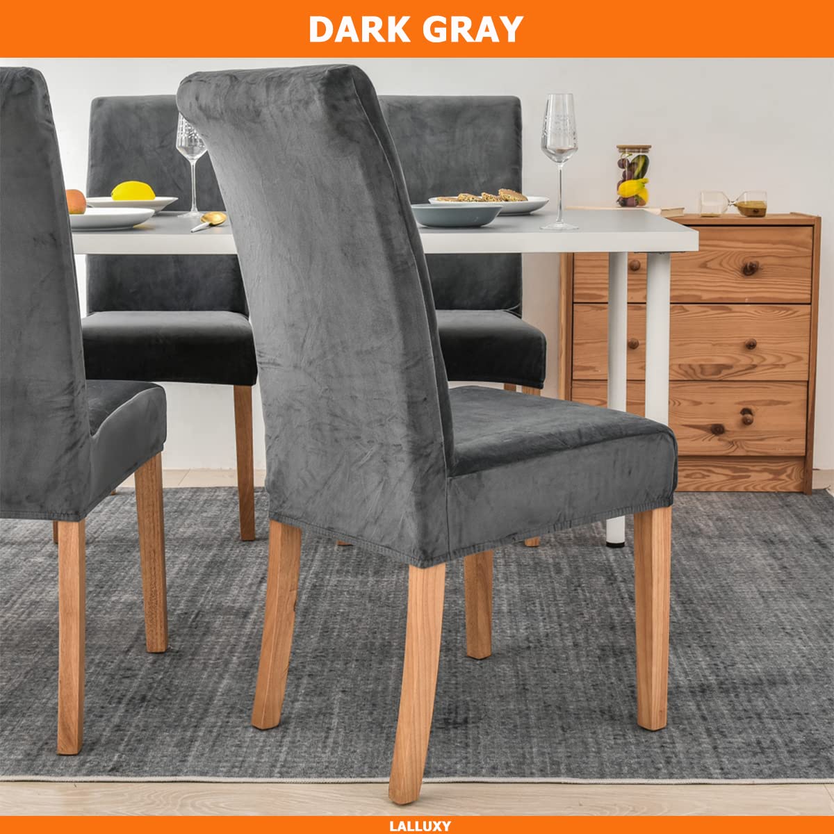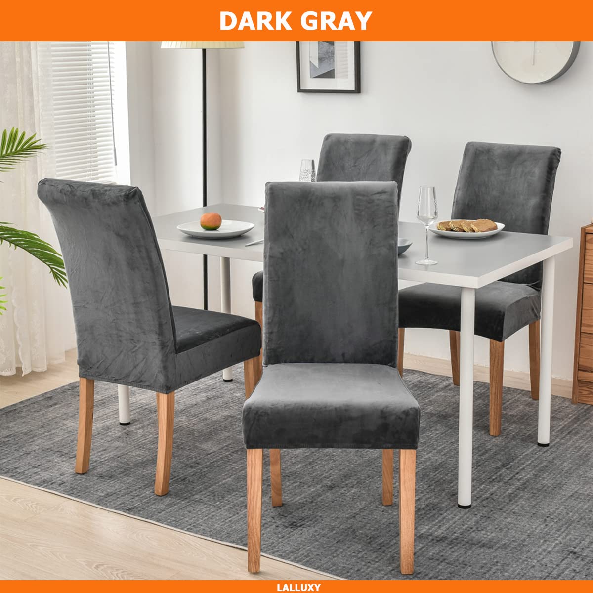 Lalluxy Velvet Dining Chair Slipcovers 6 Pack Fit Chair Size: Back Height: 18-24Inch (45-60Cm) Seat Length: 14-19Inch (36-48Cm) Seat Width: 14-19Inch (36-48Cm) Seat Thickness: 1.5-4.7Inch (4-12Cm) Material: 92% Polyester 8% Spandex Features: Soft Stretchy Comfortable Wrinkle Resistant No Ironing Needed Protect From Pet, Kids, Spills, Stains, Grease, Dust And Wear & Tear. Easy To Install And Care Sewn-In Elastic Hem Add A Fresh Look And Great Protection To Your Furniture Usages: Renew Old Chairs Protect New Chairs Great For Hotels Weddings Parties Meetings Celebrations Ceremonies Dining Room Decoration