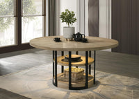 LILOLA LIVING Eden 59' Round Rustic Oak Dining Table with LED Light, Black Metal Frame, Shelves