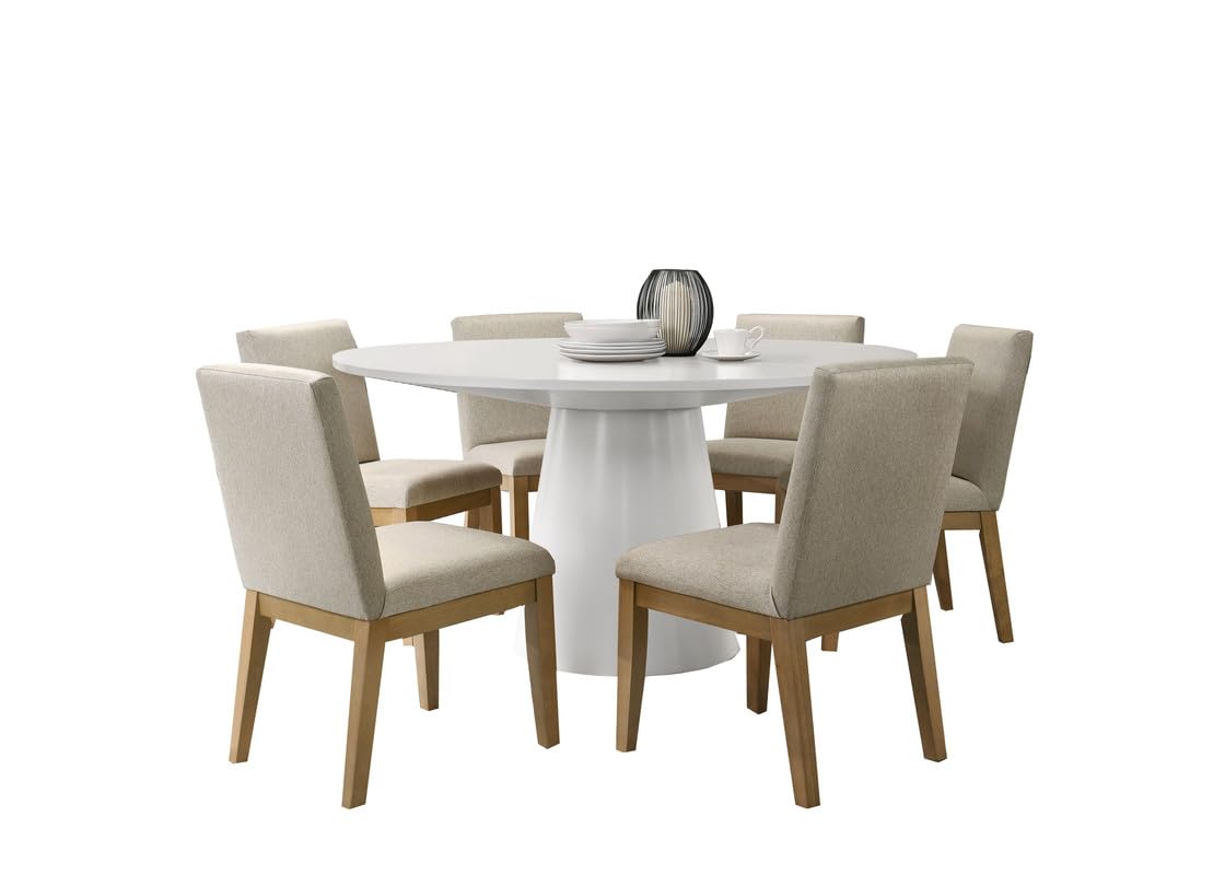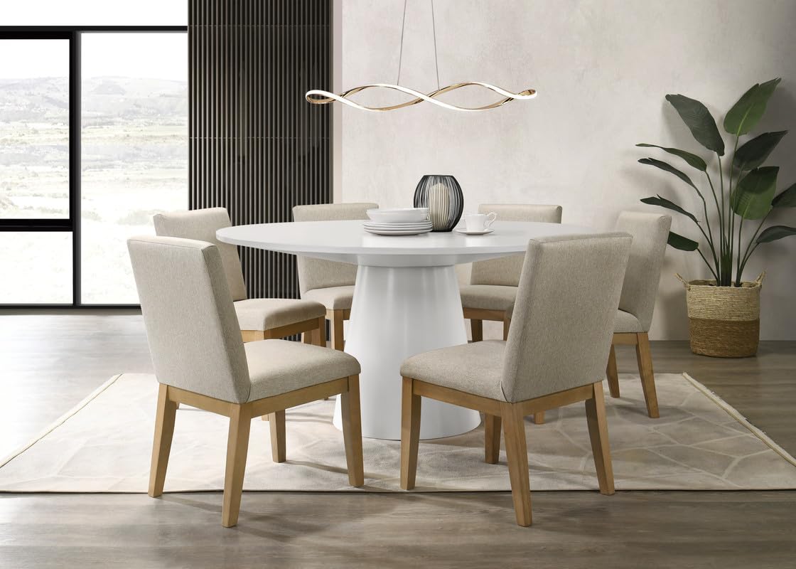 Revamp your dining area with the distinctive 7-piece table and chair set from the Jasper collection. This set redefines modern elegance with its striking round pedestal table that stands as a statement piece in any room. The accompanying chairs, designed for both comfort and style, feature sleek lines and a contemporary flair that perfectly harmonizes with the table. Together, they create an inviting and sophisticated dining space, ideal for hosting dinners or enjoying everyday meals. Make your dining room the talk of the town with this exceptional blend of design and functionality.