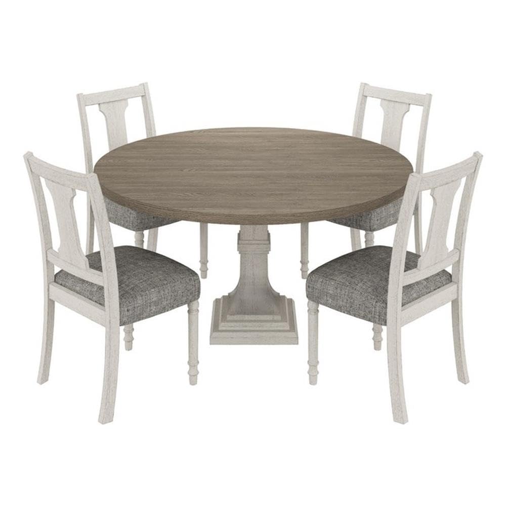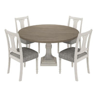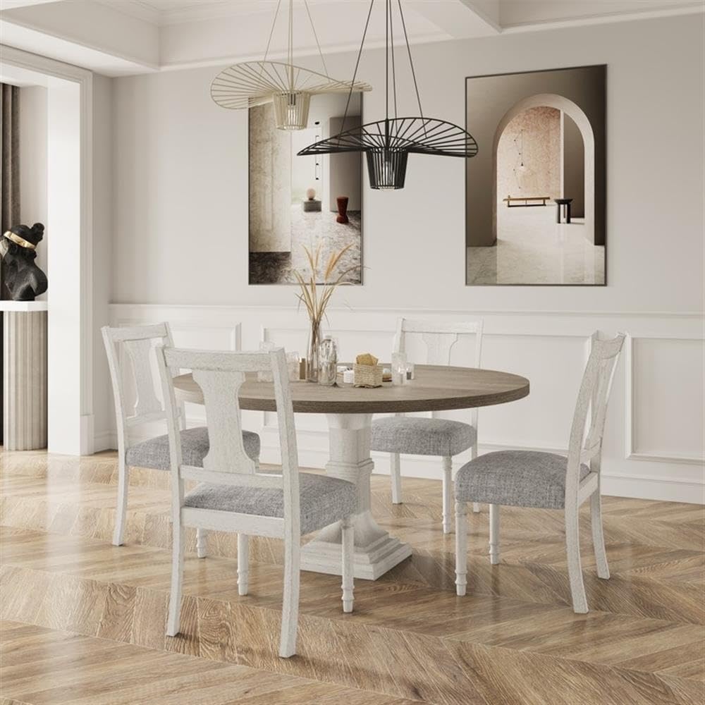 Unite elegance and functionality in your dining space with this exquisite set that includes the Tannen dining table and four matching side chairs. The table, a masterpiece of design, features a spacious 59" round tabletop poised elegantly on a robust pedestal base, promising both style and stability. Its natural grain variation and distressed finish inject a touch of rustic charm. The side chairs, designed to complement the table, blend ergonomic comfort with a sleek, minimalist aesthetic. Together, the set creates a harmonious dining environment, perfect for both everyday meals and special occasions, embodying sophistication without sacrificing comfort.