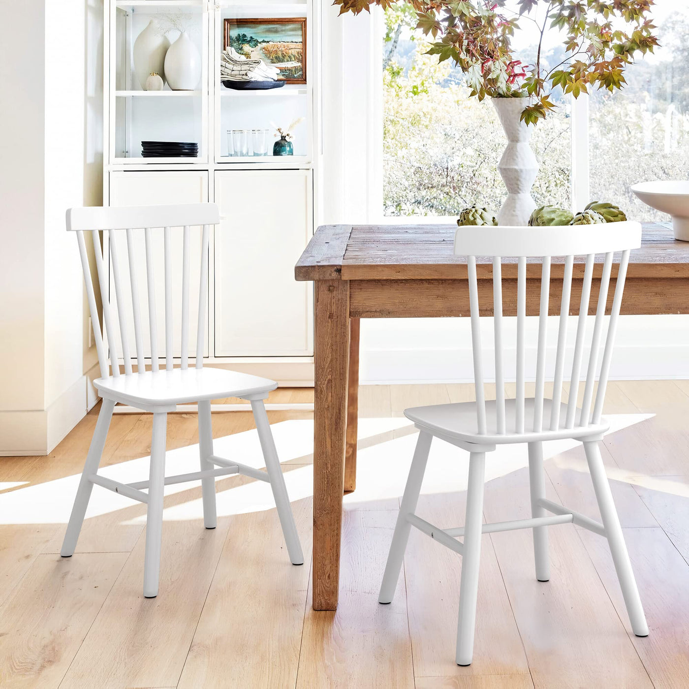 Lue Bona Windsor Dining Chairs Set Of 2, Solid White Wood, Slat Back, Arm Rest, Cushion Availability