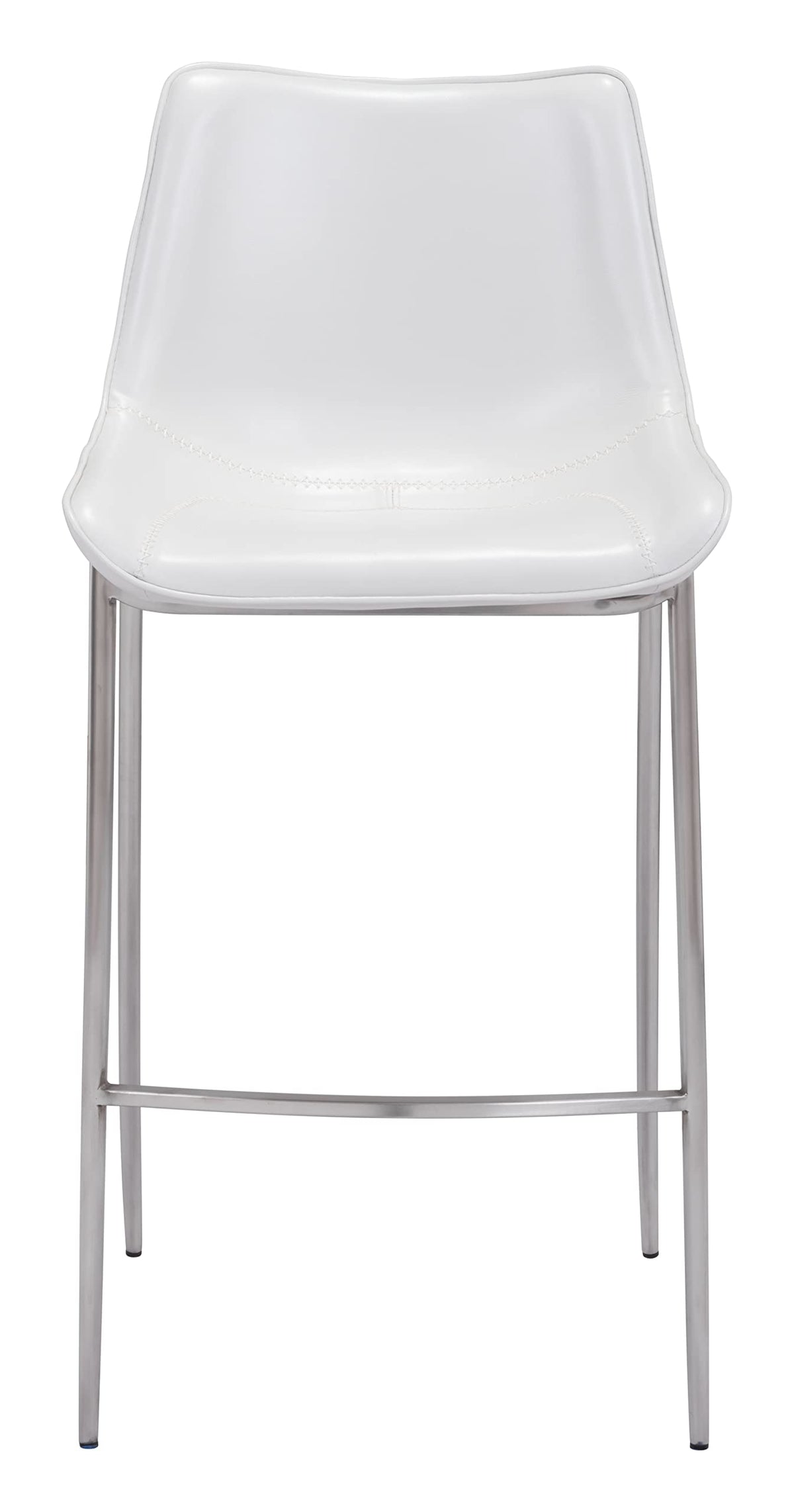 High design meets everyday casual. This handsome bar chair with its slim profile pulls up perfectly to the bar. Its super comfortable curved seat is covered in white faux leather with dramatic stitching. Brushed stainless steel legs are complete with protective plastic feet to keep your floors scratch-free.