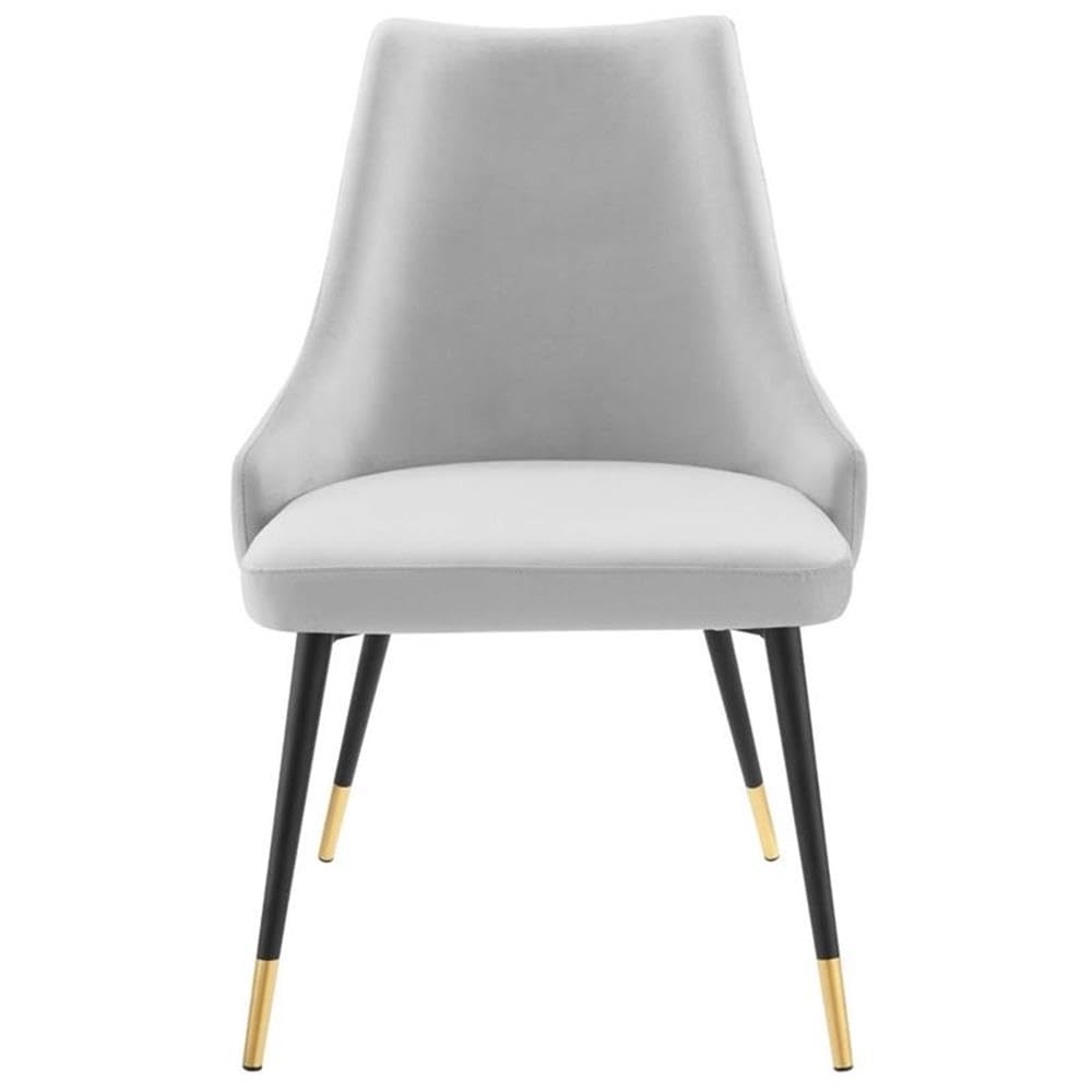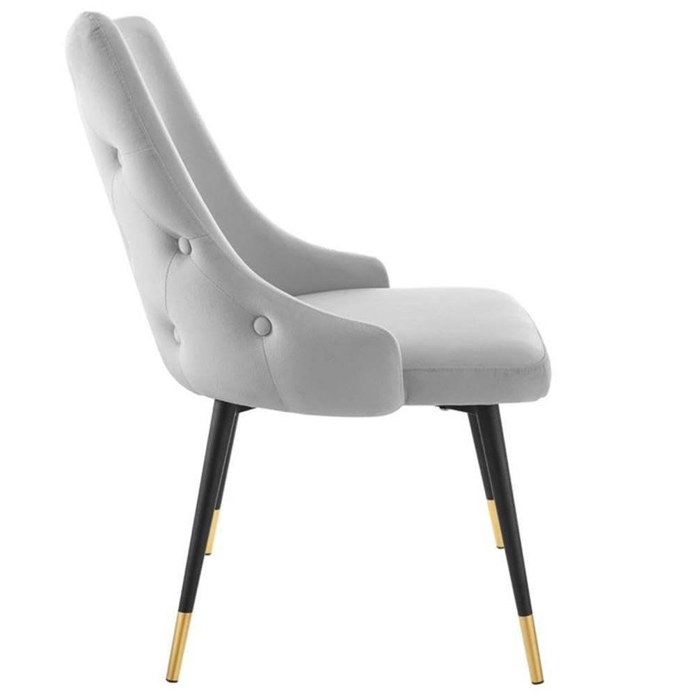 Revitalize dining decor or your living space with the Adorn Tufted Performance Velvet Dining Side Chair. Classic button tufting along the chair's exterior and graceful sweeping lines blend seamlessly into the lush comfort of this dining chair. With soft stain-resistant performance velvet upholstery, this accent chair offers a comfortable place to rest with dense foam padding. Sitting on four black tapered legs with gold foot sleeves, Adorn's versatile vintage modern style and glam deco charm makes this side chair ideally suited for a variety of rooms. Place this velvet chair around the dining table, or use it as an accent chair in the living room, bedroom or entryway, or update your home office seating with use as a cute desk chair. This modern dining chair supports up to 300 lbs. and is complete with non-marking foot caps to protect your flooring. No assembly required.