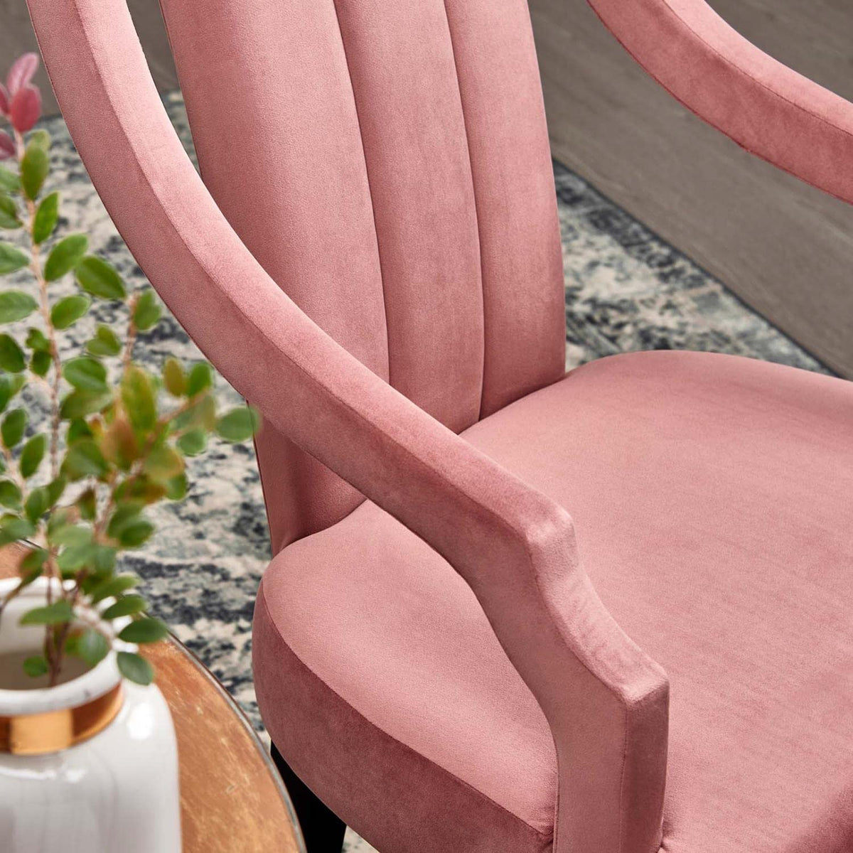 The luxurious essence of the Virtue Performance Velvet Armchairs deliver a desired wow factor to your dining table. This upholstered armchair set is covered in a rich, stain-resistant performance velvet and is defined by its unstoppable charisma. Offering unwavering support and comfort, the seat cushions are padded with dense foam. Precise channel tufting on the backrest adds essential detail and interest while the curved armrests flow gracefully from the powerful top rail, briefly curving inward, then straightening to snuggle securely into the sides of the plush seat cushion. This velvet chair set is braced by solid rubberwood tapered legs resting on non-marking foot pins and exudes a glam deco vintage appeal. Chair Weight Capacity: 500 lbs.Features:Materials: Solid rubberwood, velvetFinish: Dusty roseDurable stain-resistant fabricDense foam paddingSpecifications:Product Dimensions: 37"H x 23"W x 24"DProduct Weight: 24 lbsChair Weight Capacity: 500 lbs