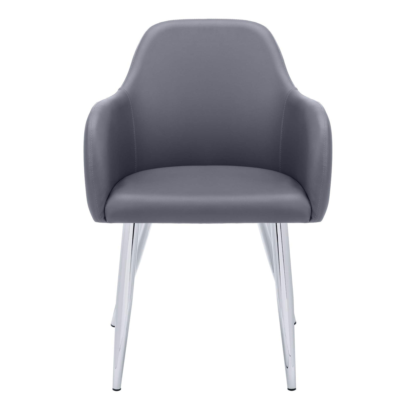 No Need To Rest Your Elbows On The Table As These Dining Chairs With Armrests Provide A Convenient Place To Put Them While Seated. Designed So That The Chairs Can Be Pushed In When Not In Use, The Integrated Armrests Are Set To The Perfect Height While Sleek And Comfortable. Upholstered In A Grey Leather-Look Fabric With Minimal Stitching For A Clean Look, The Padded Back And Sides Curve Around The Cushioned Seat For A Soft Feel. Angled And Tapered Chrome Metal Legs Add A Stylish Appeal. Sold As A 2-Piece Set, These Chairs Have A Modern-Meets-Retro Style Ideal For An Eat-In Kitchen Or Formal Dining Room, Or As Accent Chairs In Other Rooms.