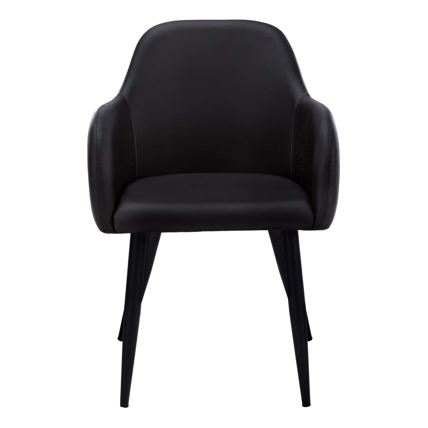 No need to rest your elbows on the table as these dining chairs with armrests provide a convenient place to put them while seated. Designed so that the chairs can be pushed in when not in use, the integrated armrests are set to the perfect height while sleek and comfortable. Upholstered in a black leather-look fabric with minimal stitching for a clean look, the padded back and sides curve around the cushioned seat for a soft feel. Angled and tapered black metal legs add a stylish appeal. Sold as a 2-piece set, these chairs have a modern-meets-retro style ideal for an eat-in kitchen or formal dining room, or as accent chairs in other rooms.