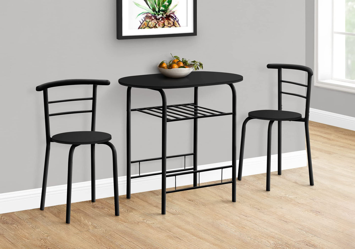 Add a modern aesthetic to your any small space with this 3 three-piece dining set. Perched atop curved metal legs, the oval table is crafted from manufactured wood, while the two chairs feature a ladderback design with tubular metal detailing. The chairs slide in perfectly for maximum space saving. Stylishly finished in a black laminate seat and table top combined with black metal, this set blends with a variety of color schemes.