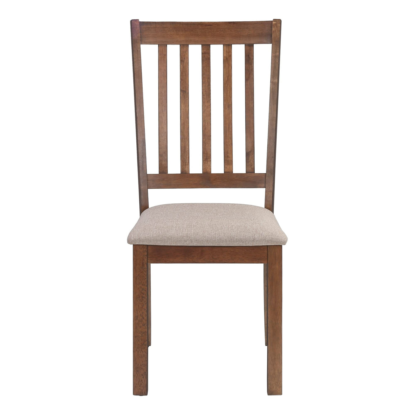 Invite your guests to pull up this set of 2 armless, contemporary slat-back chairs to the table for some great conversations! These dining chairs are designed in an open slat back style with seamless, curved back legs and straight front legs for reliable support. Upholstered in durable beige fabric with thick foam padding for long lasting comfort, and finished in a warm walnut wood grain, these cozy dining chairs will add a warm element to your casual or formal dining space. Minor assembly required.
