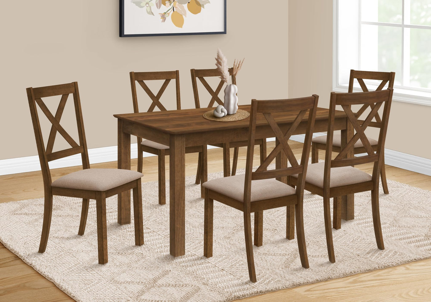 Bring cozy refinement to your dining space with this robust dining table for 6. Using high grade composite wood material, the spacious beveled rectangular tabletop is supported on thick square legs, with a warm open wood grain, brown walnut veneer finish on all sides. Slip in a set of cross-back chairs to create an inviting casual or formal dining space for family and friends. Whether your design style is contemporary or transitional, this dining table will look right at home even in a small space. For indoor use only. Assembly is required.