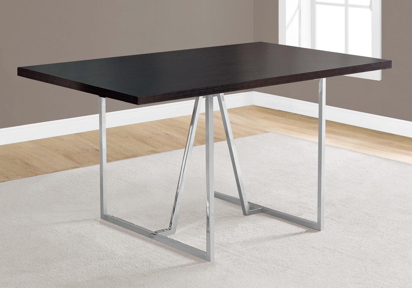 On the surface you See a clean lined modern style dining table with a smooth thick top in a contemporary cappuccino finish. Look further down and you’ll See a cool sturdy chrome metal base with a unique angular design to give it that extra edge. This multi-purpose table easily accommodates up to 4 people and will be a stand-out in your casual or formal dining room, kitchen, and it's versatile enough to even serve as a work or task table. The compact size makes for a great fit in smaller homes, apartments, or condos. Chairs are sold separately.