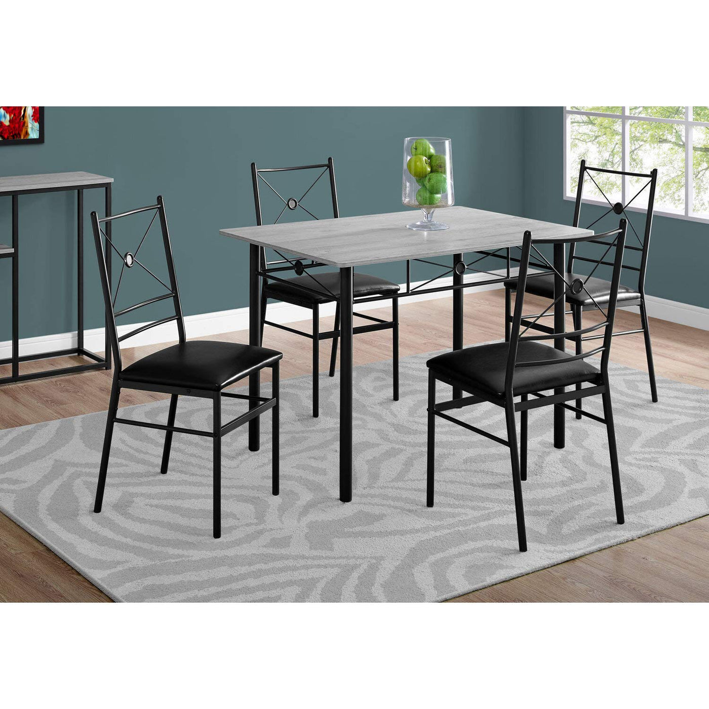 If you are moving into a new place or ready to upgrade your current casual dining space, this simple contemporary 5 piece dining set is ready to add instant style! This compact dining set nicely fits in small spaces yet it is spacious enough to comfortably seat up to 4 people. The laminated grey table top in a faux wood grain finish made from quality MDF material, contrasts nicely with the sturdy black metal base and apron embellished with an X design. The four matching black metal chairs all tuck under the table as a space saving solution, and feature a comfortable 2 inch thick black faux leather seats that are easy to keep clean. Assembly is required.
