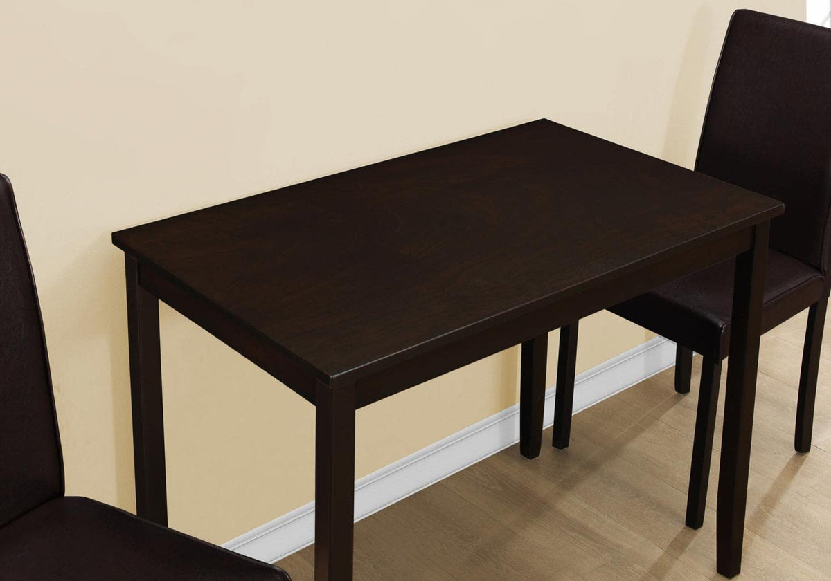 This casual three piece dining set offers a classic styling that will compliment any decor. Perfect for small spaces, the rectangle dining table features an ample surface area with solid wood legs. The comfortably padded Parsons dining chairs are finished in a rich brown easy to clean leather-look material. The simple lines of this dining set enveloped with a warm cappuccino finish create a timeless look that you will love.