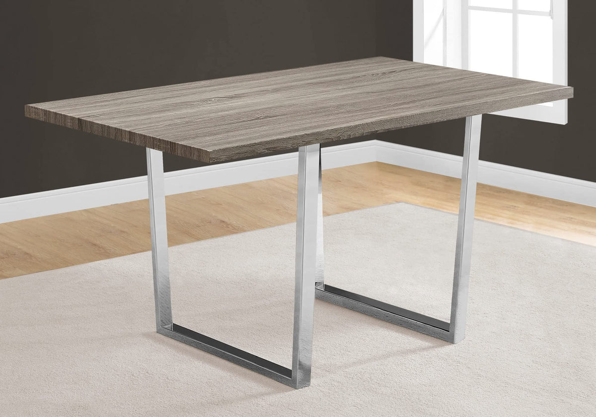The simple and contemporary lines of this versatile dining table will instantly bring style to a room! the spacious thick rectangle table top in a modern Dark Taupe reclaimed-look finish is supported by contrasting sturdy angular U-shaped chrome metal legs. This highly versatile table comfortably accommodates up to 4 people for all your gatherings and looks right at home in a casual or formal dining room, kitchen or use it as a work/task table in any space. Chairs are sold separately.