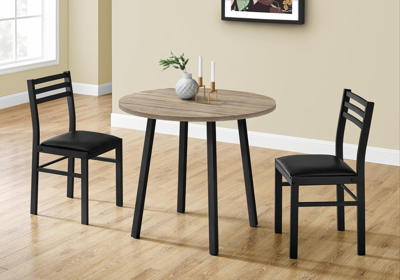 This dining table set with a drop-leaf table and 2 chairs delivers maximum style and functionality while taking up minimal space. Laminated in a dark taupe wood-look finish for a rustic touch, the tabletop and drop leaves feature thick-panel construction and are finished on all sides for a polished look even when the leaves are down. Lift up one leaf, both leaves, or keep them both down according to the surface space you need. The table legs and chair frames are in metal with a black finish for a modern look. The chair seats are padded and upholstered in a black faux leather fabric for comfort. This 3-piece set for small spaces is ideal for eat-in kitchens, apartments, and dorm rooms, and is so versatile that it can be used for more than just dining. The all-purpose round table can function as an office desk for studying or working from home and as an accent table for displaying decorative items, while the lightweight yet sturdy chairs can serve as a desk chair or guest chairs. Additional measurements: Depth of chair seat: 14.5 inches Height of chair back from seat: 15 inches Height from floor to seat: 18 inches
