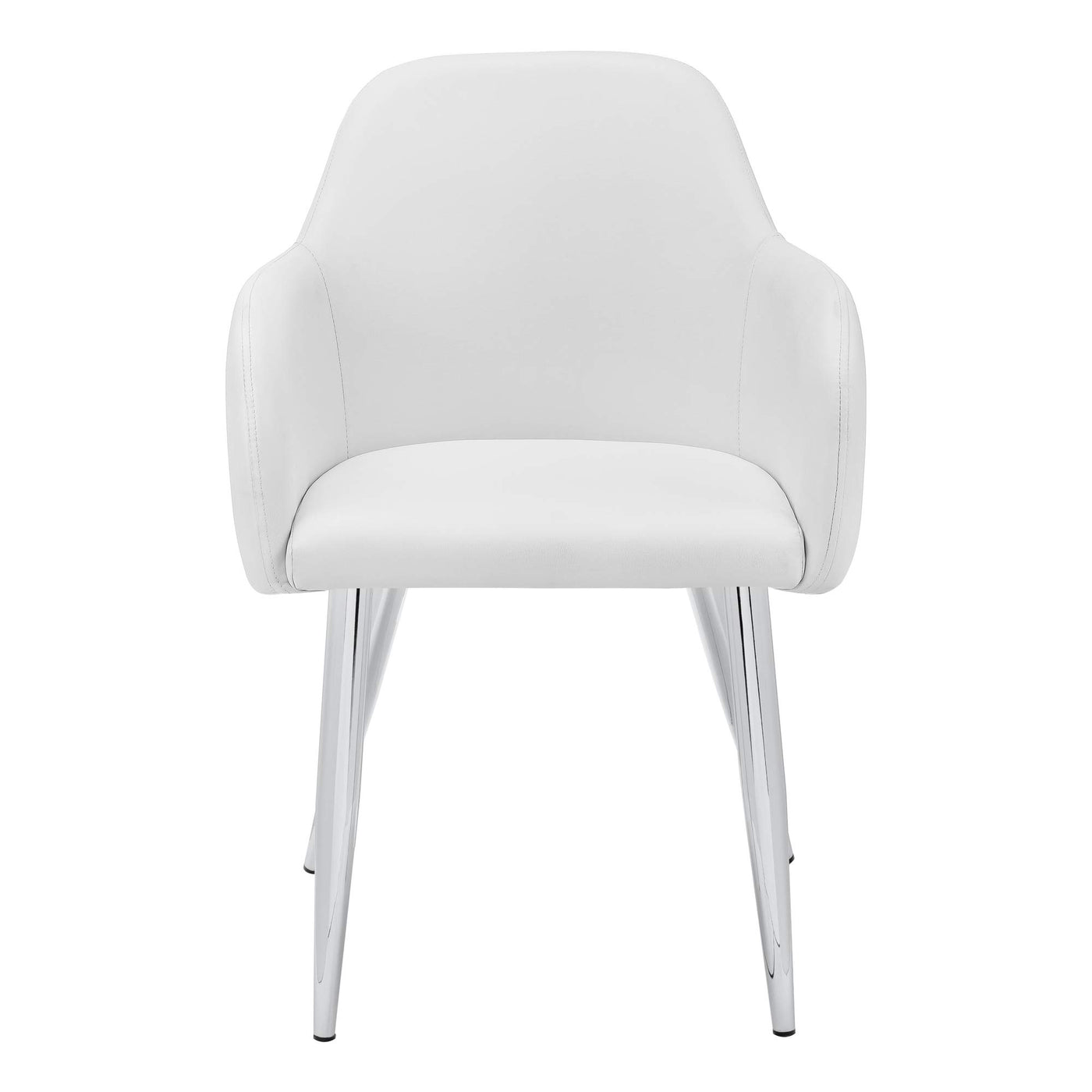 No need to rest your elbows on the table as these dining chairs with armrests provide a convenient place to put them while seated. Designed so that the chairs can be pushed in when not in use, the integrated armrests are set to the perfect height while sleek and comfortable. Upholstered in a white leather-look fabric with minimal stitching for a clean look, the padded back and sides curve around the cushioned seat for a soft feel. Angled and tapered chrome metal legs add a stylish appeal. Sold as a 2-piece set, these chairs have a modern-meets-retro style ideal for an eat-in kitchen or formal dining room, or as accent chairs in other rooms.