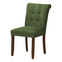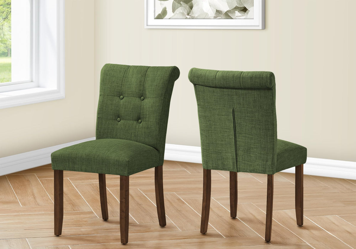 Small changes can make a big impact, starting with this set of 2 upholstered linen-look green fabric dining chairs. Standing at a 38' height, these classically modern chairs boast a fashionable style that effortlessly complements any casual family dining space. The sturdy construction with brown walnut wood legs and comfortable, thick cushioned seat and tufted back ensures durability for years to come in your dining room or kitchen space. Easy to assemble with illustrated instructions includes, these side chairs will be the perfect addition to a contemporary or transitional style dining table (sold separately). This set of chairs come with a 2 year limited warranty against any manufacturer defects, so you can rest assured that you are investing in quality and style. Upgrade your seating with these chic dining chairs today!