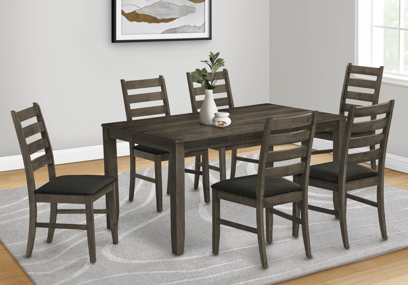 SET OF 2 UPHOLSTERED DINING CHAIRS: This set of 2 side chairs in a warm antique grey finish with grey fabric upholstered seats, brings fashionable style to your kitchen or dining room. | STURDY CONSTRUCTION: Standing at a 38' height with solid wood legs and a ladder back design offers a comfortable and durable seating for everyday casual family dining or entertaining. | PADDED CUSHIONING: The padded seats with foam cushioning and a solid back offer added comfort for long conservations around the dinner table. | EASY TO ASSEMBLE: The illustrated, step by step instructions makes this an easy to assemble set. | 2 YEAR LIMITED WARRANTY: These transitional style chairs come with a 2 year limited warranty against any manufacturer defects for your convenience.