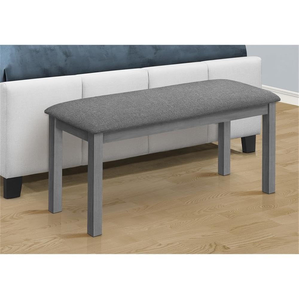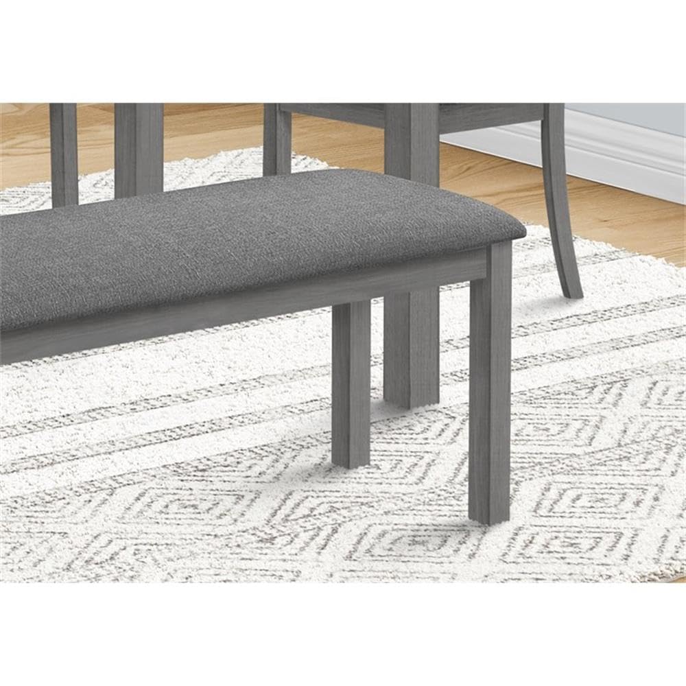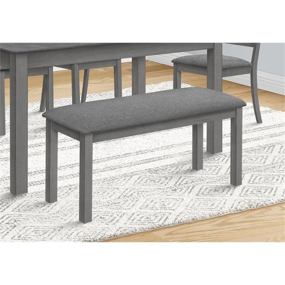 Bring comfort and style to your dining table with this washed grey upholstered bench, in a simple transitional design. A great alternative to a dining chair, this durably designed 42 rectangular bench features a comfortable, padded thick foam seat covered in a dark grey fabric. Perfect for family dining, the sturdy wood legs in a washed grey finish, frame the backless bench, seamlessly fitting into any casual dining room or kitchen. Easy to assemble, this practical and space saving dining bench will instantly upgrade your dining space with this on-trend seating option.