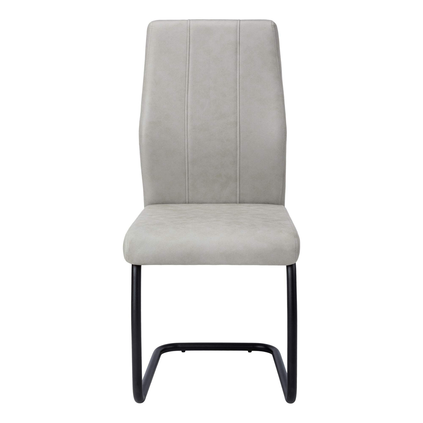 The clean modern lines of this set of 2 side dining chairs will instantly revive your dining space. The chairs are upholstered in a rich faux-suede Grey fabric. With a luxuriously comfortable curved back accented with 2 vertical rows of stitching, cushioned seat, and a sturdy U-shaped black metal base you will be dining in style in no time! Mix and match with one of our contemporary style tables to complete the set. Assembly is required.