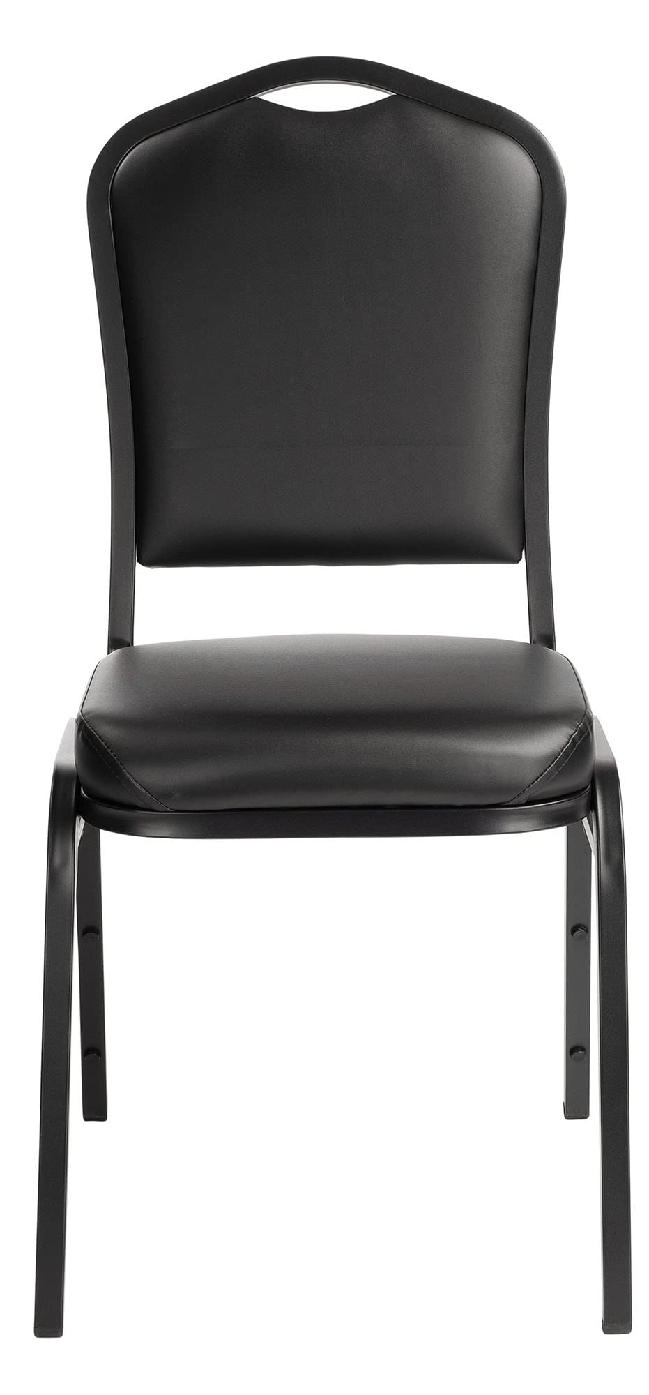 The 9300 silhouette stack chair is durable and classy enough to use in your busiest social setting, be it a dining room or corporate banquet hall. It features a strong square 18-gauge steel frame plus an under-seat H-shaped brace for extra support. The seat features supremely comfortable and spacious 2 -thick high-density foam padding with institutional grade vinyl upholstery or fabric, and a waterfall-style edge. Plywood core within both the seat and crown-style backrest which has a built-in handle for easy moving and stacking. Fortifying stacking bars and twelve plastic bumpers protect the powder-coated paint finish from scratches when the chair is stacked (up to ten units high.)
