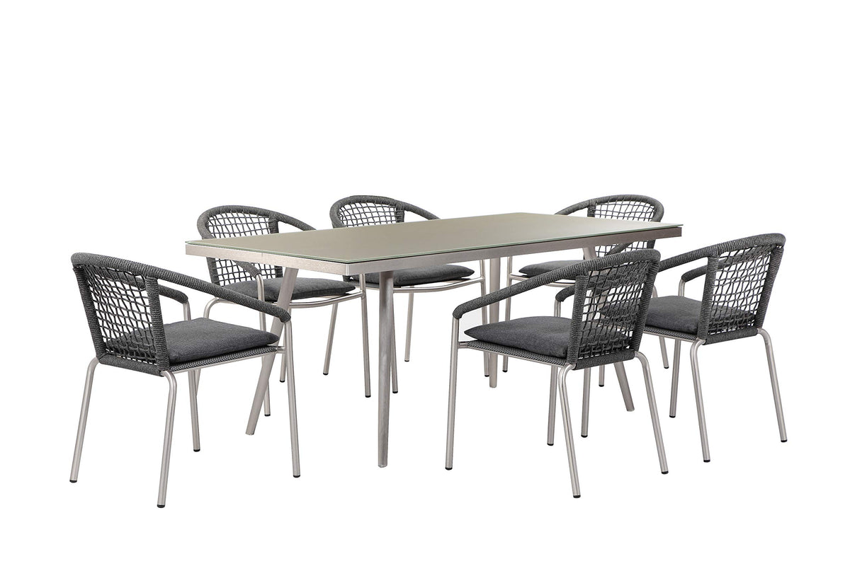 Descriptionthe Chelsea 7 Piece Sofa Set Is A Beautiful Combination Of Rope And Aluminum. Aluminum Frame Will Never Rust. Rope Is Made To Be Used Outdoor And Is Similar To What You Will Find On Yatchts. Cushion Fabrics Are Removeable And Washable. You Will Love This Set For Its Low Maintance And Built To Last Materials! Set Includes 6 Stackable Chairs And Dining Table