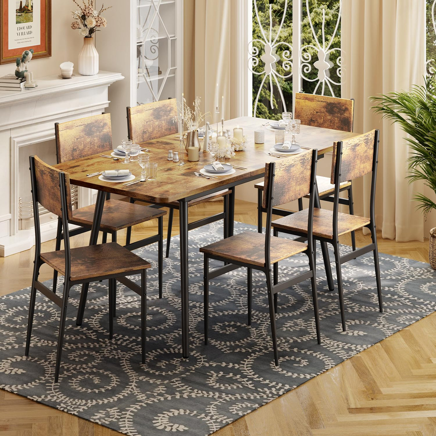 Qsun 63” Extendable Dining Table Set For 4-6 People, 7-Piece Dining Table Set For 6 People With 6 Chairs, Mdf Wood Board Kitchen Table Set For Small Space And Apartment, Rustic Brown