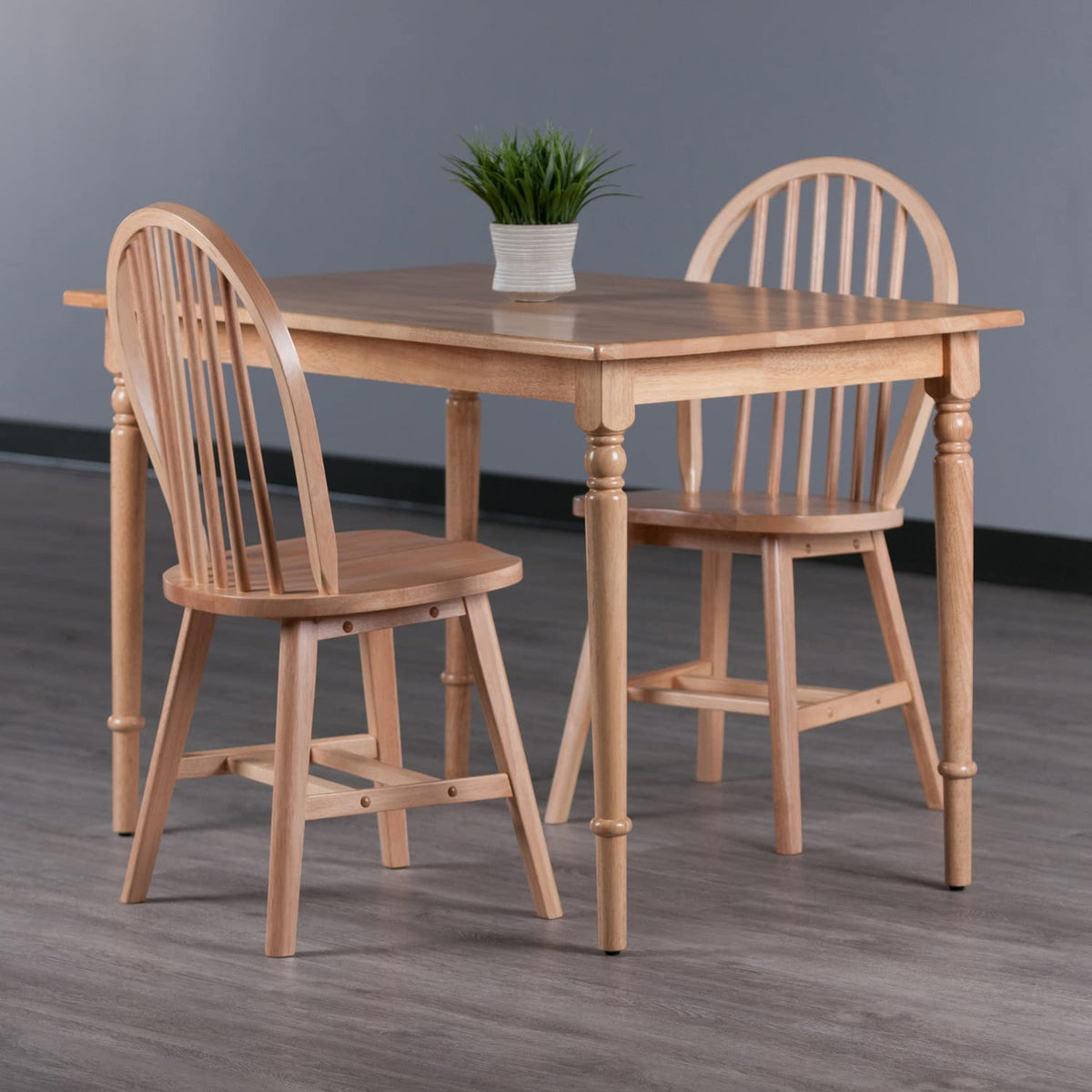 Vintage charm and simplicity are the hallmarks of the 3-Piece Ravenna Dining Table Set. The warmth of wood in a relaxed natural finish will anchor your dining room or kitchen, allowing for creative and colorful choices in surrounding home decor. The table has classically turned legs, gently rounded corners, and full aprons, all contributing to a welcoming feel in this farmhouse-style table. At over 47" wide, it can seat six, and yet won't overwhelm smaller dining areas. The set includes two Windsor Chairs in natural, with comfortable contoured seats, slightly angled legs and spindled backs that complement the table's country cottage feel. The double set of crossbars make the chairs sturdy and durable. Table and chairs are made of solid wood. Ships in 2 boxes that include all the hardware needed for assembly. Table dimensions: 47.2"W x 29.5"D x 30"H Clearance from ground to apron: 26.7"H Distance between legs: 38.9"W (longer side); 21.2"W (shorter side) Static weight capacity for tabletop: 125 lbs. Chair dimensions: 17.9"W x 20.5"D x 36.7"H Seat height: 17.8"H Height of backrest: 19.7"H Static weight limit: 220 lbs. Assembly required Ships in 2 boxes