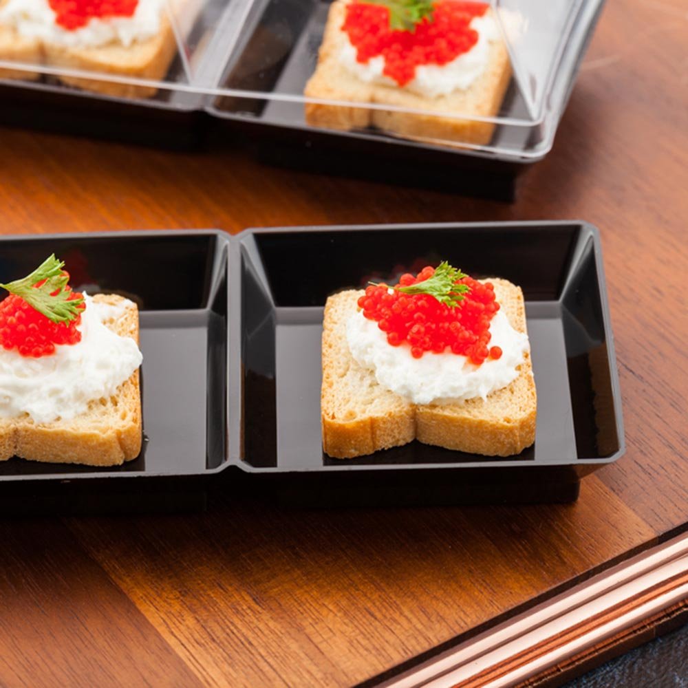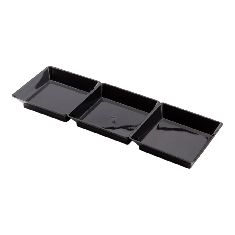 Showcase A Series Of Your Miniature Appetizers And Desserts With Our Black Mini Terzetto Plates. Featuring An Innovative 3 Compartment Design, These Sleek Black Plastic Plates Instantly Upgrade The Look Of Any Tablescape Or Venue. Containing Up To 3 Ounces, These Plastic Divided Plates Are Great For Serving Small Appetizers, Desserts, Hors D'Oeuvres, And More. Use These Modern Sectioned Plates To Stylishly Present Charcuterie Platters At Your Next Catering Event, Or To Beautifully Display 3 Different Flavors Of Mini Cheesecakes At Your Restaurant. Protect Your Delicious Small Dishes With Our Coordinating Clear Terzetto Lid (Sku: Rwp0052C). Each 3-Ounce Divided Plastic Plate Measures 7 Inches Long By 2.5 Inches Wide And Ships In A 20 Count Box.