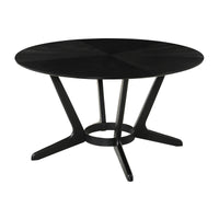 Embrace a sophisticated and charming centerpiece for your dining room with our Santana Round Wood Dining table. Perched upon a sculptural base with beautifully crafted splayed legs, our modern round dining table serves as an elegant focal point for any room. It plays around with the angles of wooden grains to achieve a rich and eye-catching tabletop. Our versatile and mid-century modern dining table can effortlessly complement a variety of different styles. Its space-friendly proportions make it a perfect fit for eat-in kitchens and dining rooms. The round shape of our dining table makes it a natural hub for conversations and spending leisurely time. The 54 diameter tabletop easily allows seating for 6. Crafted from a combo of engineered and rubberwood, our dining table is well-constructed and durable enough for daily use. The Santana Dining Table is available in your choice of a rich walnut or sleek black wood finish to serve as the perfect complement to your daily meals and garnished dinners.