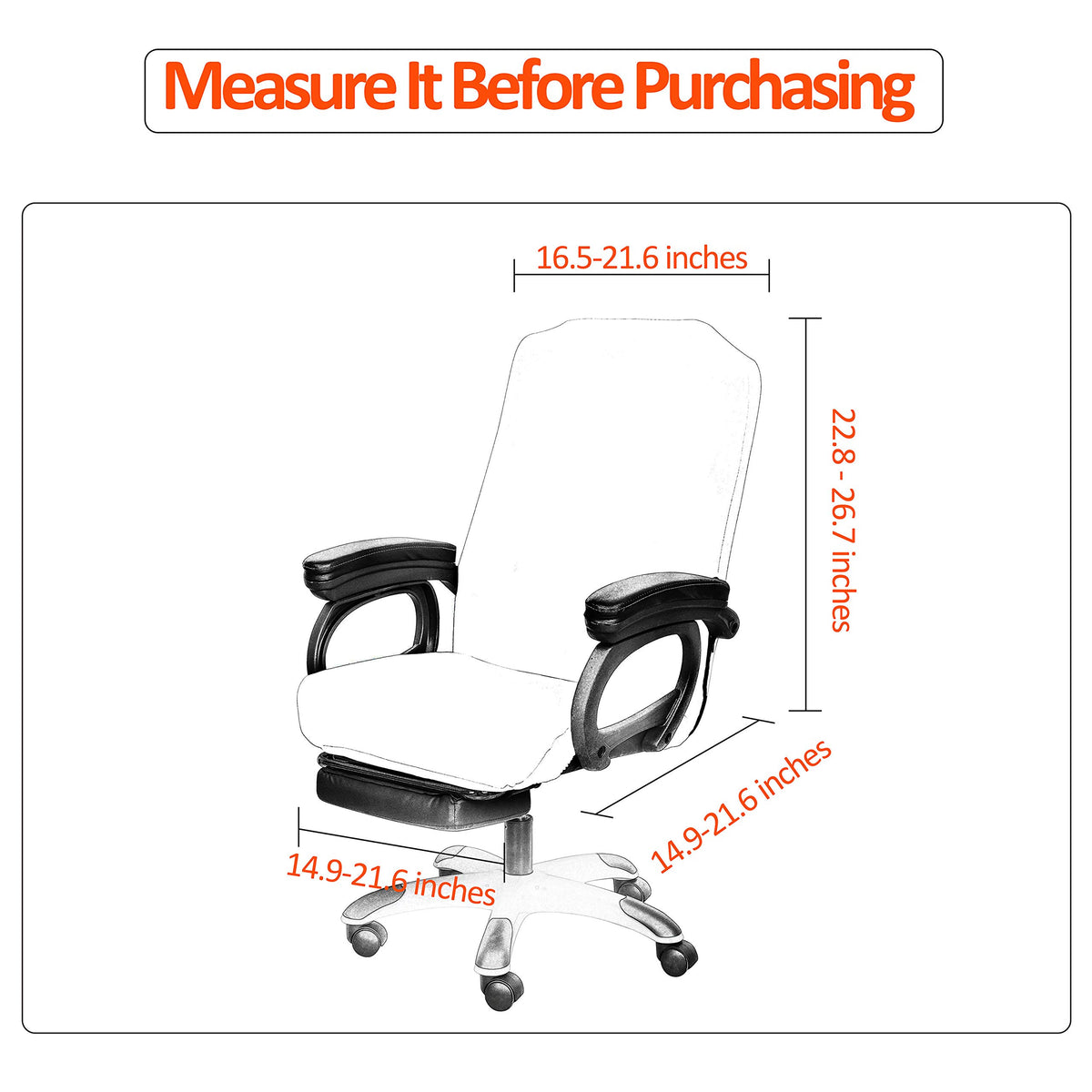Q: What sizes of chairs does the SARAFLORA Office Chair Cover fit?A: The SARAFLORA Office Chair Cover is designed to fit medium-sized chairs. Specifically, the chair back dimensions should be between 16.5 to 21.6 inches in width and 22.8 to 26.7 inches in height, while the chair seat should measure between 14.9 to 21.6 inches in width and length.
