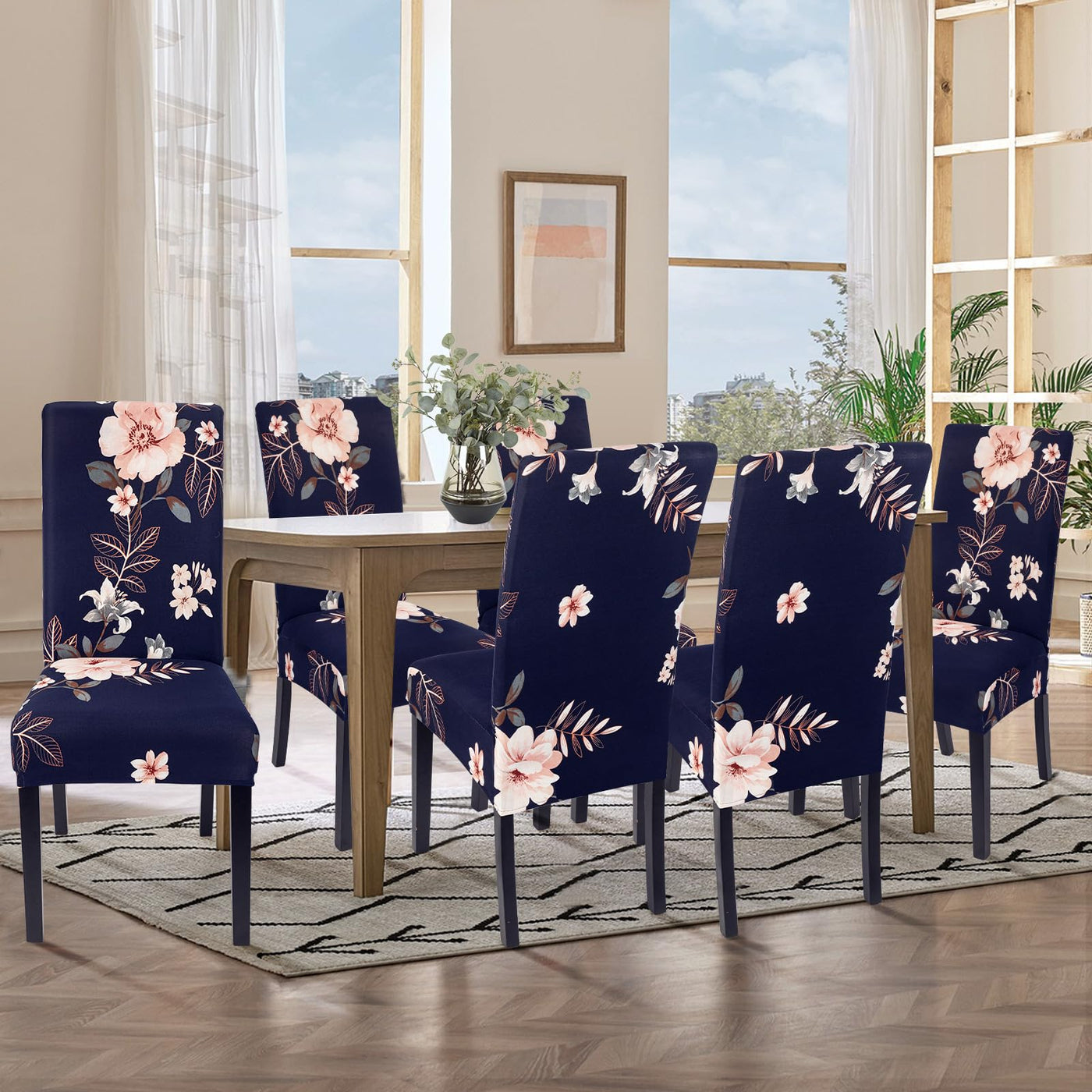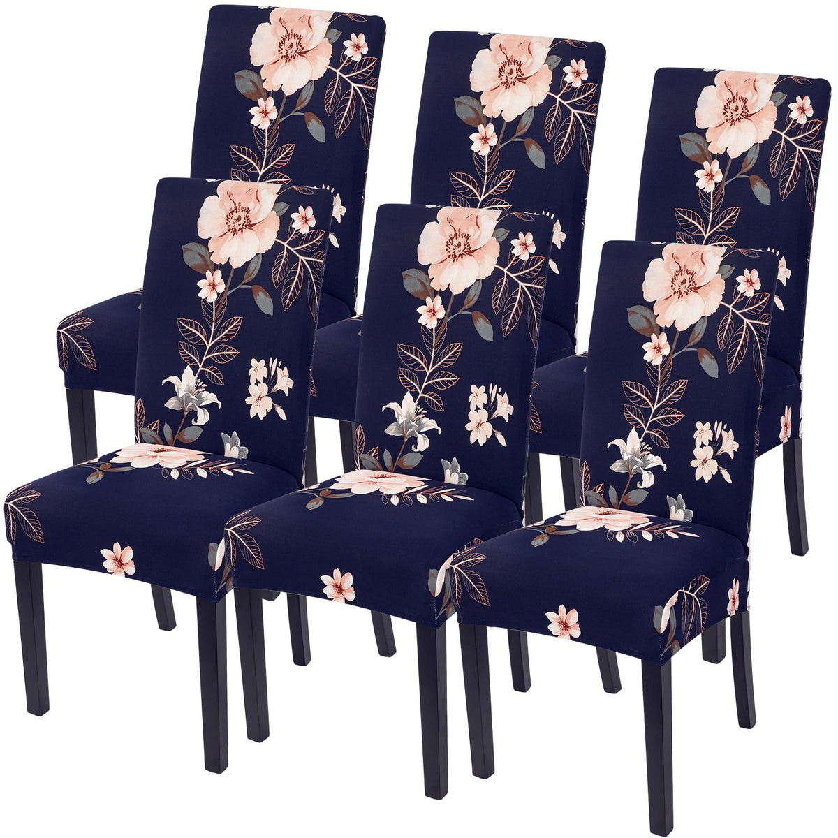 Searchi Chair Covers, Set Of 6, Spandex Super Fit Stretch Removable Washable Kitchen Parsons Chair Protector For Dining Room,Hotel,Ceremony, Navy+Flowers