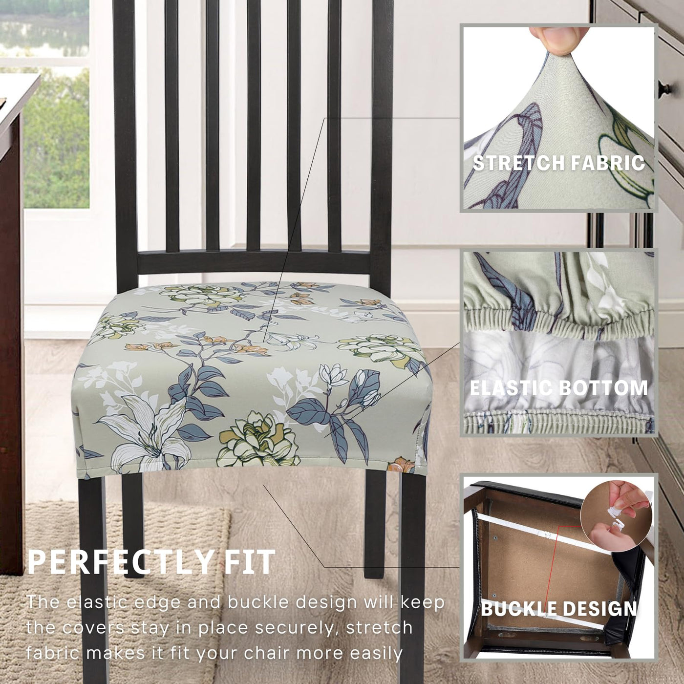 Searchi Stretch Dining Chair Seat Covers Set Of 6, Soft Removable Washable Seat Covers For Dining Chairs, Dining Room Seat Cover Protector (Rear-Covered, Green Grey Flower)