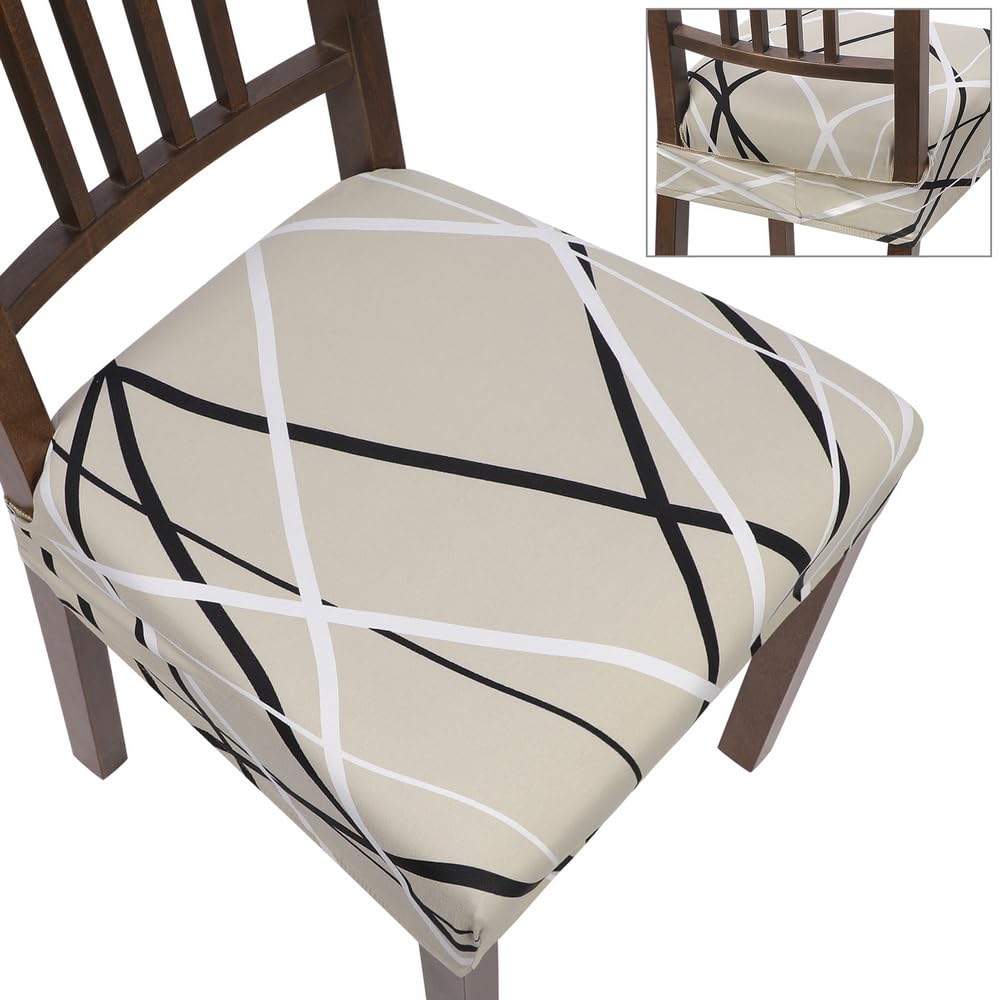 Searchi Stretch Dining Chair Seat Covers Set Of 6, Soft Removable Washable Seat Covers For Dining Chairs, Dining Room Seat Cover Slipcover Protector (Rear-Covered, Beige Stripe)